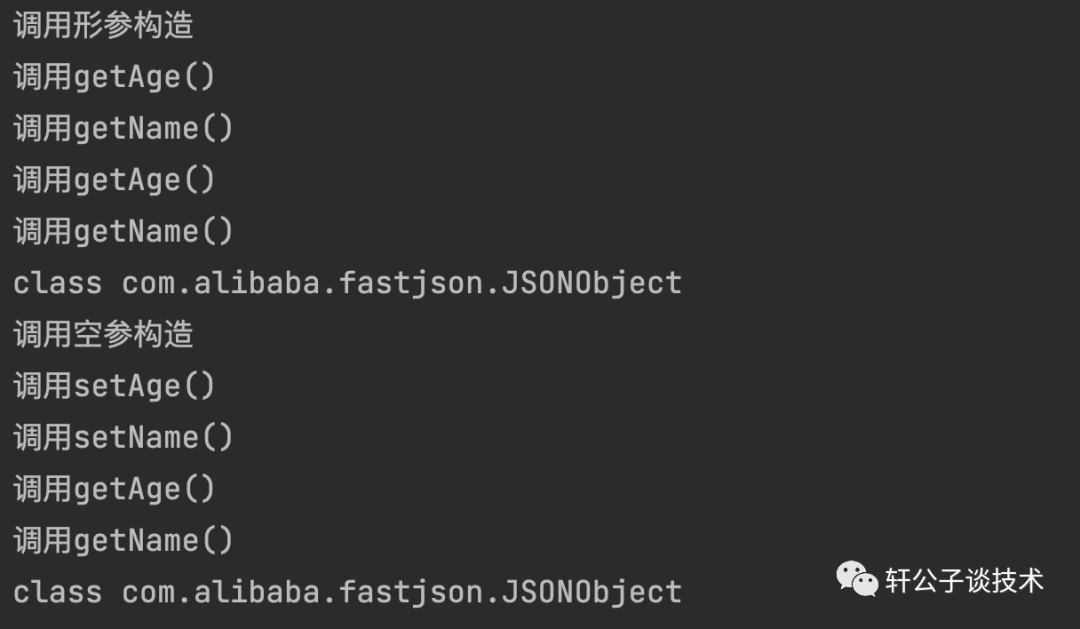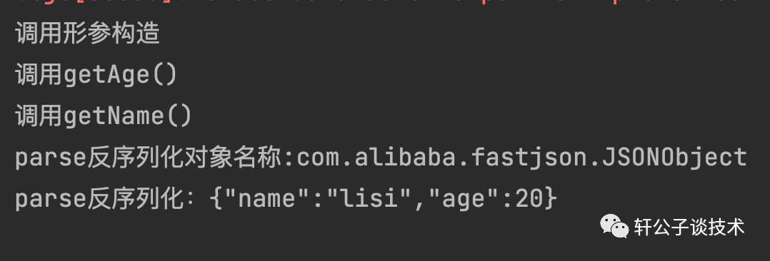 User user = new User("lisi", 20);String serializedStr = JSON.toJSONString(user);Object obj1 = JSON.parse(serializedStr);System.out.println("parse反序列化对象名称:"+obj1.getClass().getName());System.out.println("parse反序列化:"+obj1);