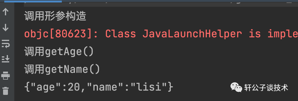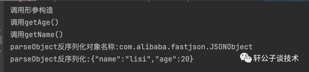 User user = new User("lisi", 20);String serializedStr = JSON.toJSONString(user);Object obj2 = JSON.parseObject(serializedStr);System.out.println("parseObject反序列化对象名称:"+obj2.getClass().getName());System.out.println("parseObject反序列化:"+obj2);