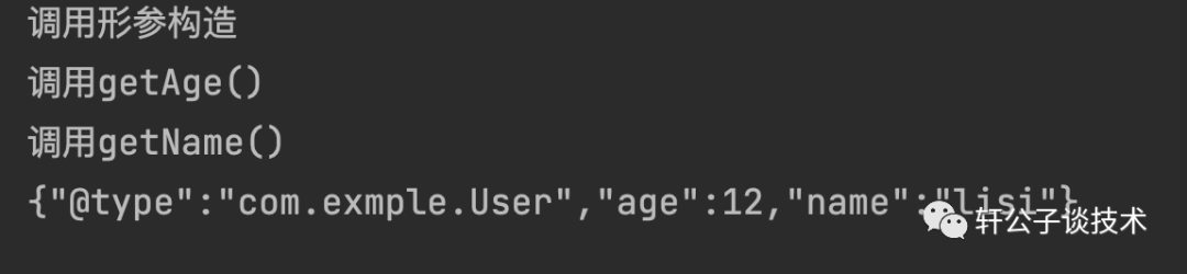 User user = new User("lisi",12);//不写User.class 让它自己去调用String serializedStr1 = JSON.toJSONString(user,SerializerFeature.WriteClassName);System.out.println(serializedStr1);