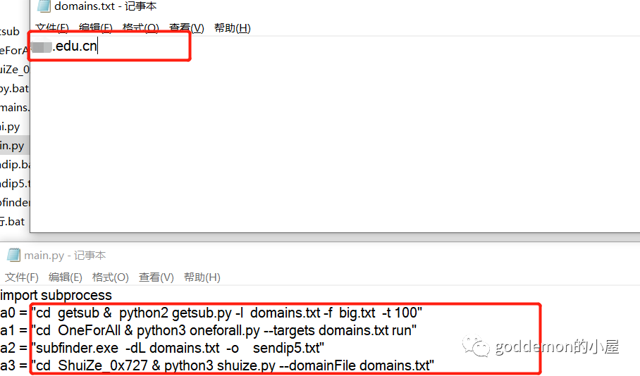 然后扔到自己写好的脚本里面,去进行批量获取子域名,这里点一下,直接集成多个子域名收集工具,然后一个python函数调用,自动化收集全子域名即可。