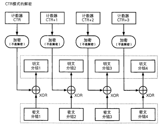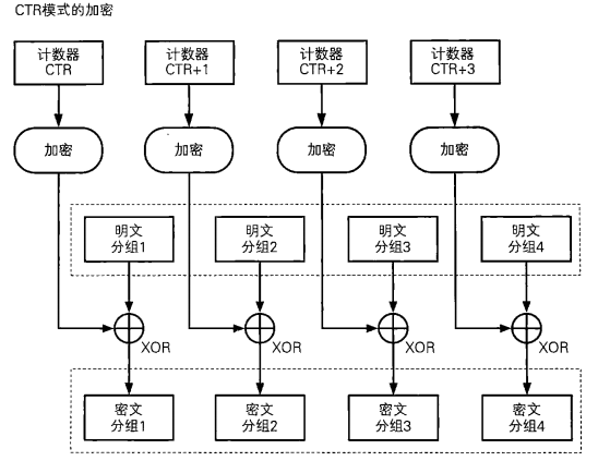CounTeR, 计数器模式,它是一种通过将逐次累加的计数器进行加密来生成密钥流的流密码(如下图)。CTR模式中,每个分组对应一个计数器,并通过对计数器进行加密来生成密钥流,然后再与明文分组进行XOR操作得到密文分组。