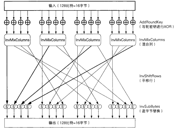 AES加密的SubBytes、ShiftRows、MixColumns操作都存在反向运算InvSubBytes、InvShiftRows、InvMixColumns。