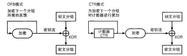 密码算法的输入端进行加密,然后再把加密后的秘钥流和当前分组的明文进行异或操作生成当前分组的密文。由密码算法所生成的比特序列称为密钥流。密码算法就相当于用来生成密钥流的伪随机数生成器,而初始化向量就相当于伪随机数生成器的种子。