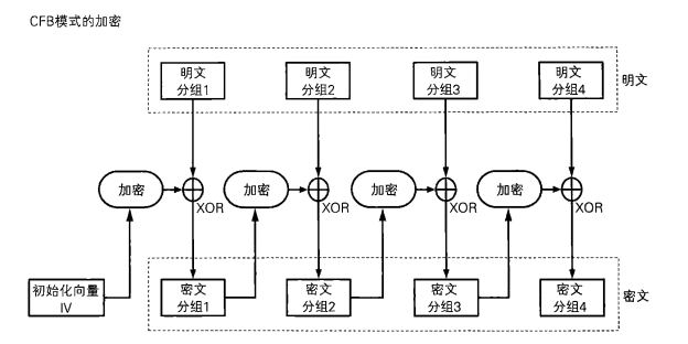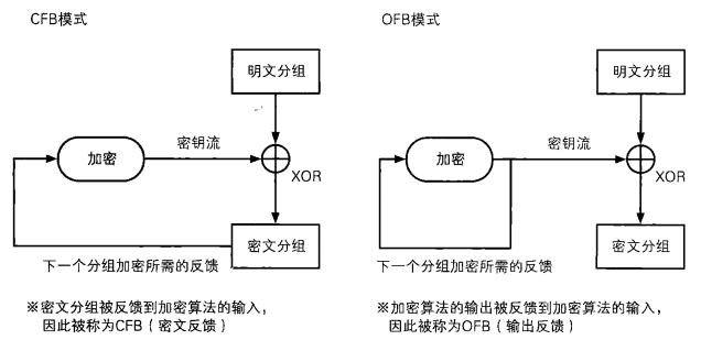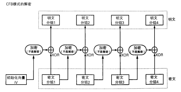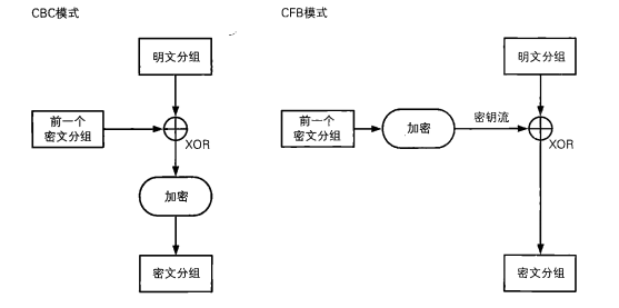 通过对比CBC模式与CFB模式发现,在CBC模式中,明文分组和密文分组之间有XOR和密码算法两个步骤,而在CFB模式中,明文分组和密文分组之间则只有XOR。