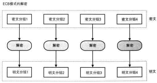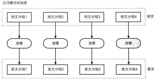 ECB(Electronic Code Book, 电子密码本模式),是最简单的分组模式。明文消息被分成固定大小的块(分组),并且每个块被单独加密。如果最后一个明文分组的内容小于分组长度时,需要用一特定的数据进行填充(padding)。特点:每个块的加密和解密都是独立的,且使用相同的方法进行加密,所以可以进行并行计算,所以效率较高。但是,由于密文有规律,如果有一个块被破解,那么使用相同的方法可以解密其他块中的数据,所以安全性较低,容易被破解。