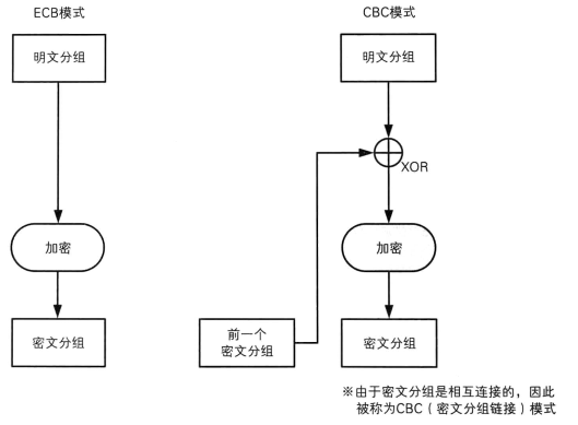 如果将一个分组的加密过程分离出来,我们就可以很容易地比较出ECB模式和CBC模式的区别 。ECB模式只进行了加密,而CBC模式则在加密之前进行了一次XOR。