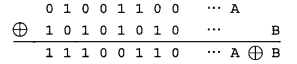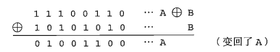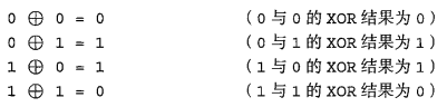 XOR的全称是exclusive or,在中文里叫作异或。由于XOR和加法运算很相似,因此一般用+和O组合而成的符号⊕来表示XOR。如果两个比特序列执行异或运算,只要对其中每个相对应的比特进行XOR运算就可以了(如下图)。