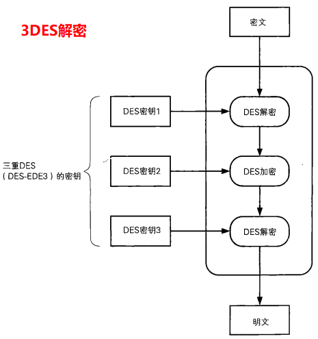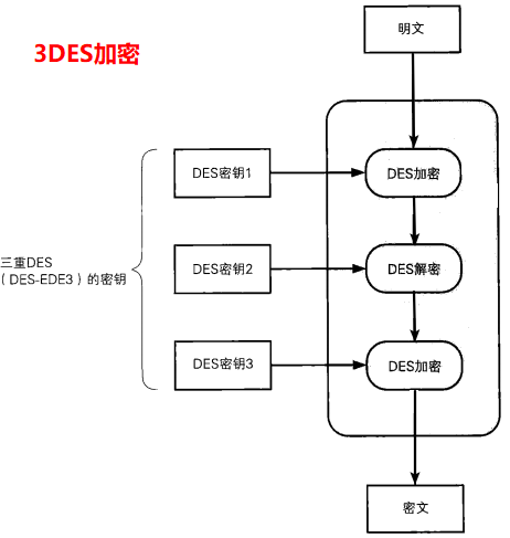 现在DES已经可以在现实的时间内被暴力破解,因此我们需要一种用来替代DES的分组密码,3DES就是出于这个目的被开发出来的。3DES是为了增加DES的强度,将DES重复3次所得到的一种密码算法(如下图)。明文经过三次DES处理才能变成最后的密文,由于DES密钥的长度实质上是56比特,因此3DES的密钥长度就是56×3=168比特, 加上用于错误检测的标志位8x3, 共