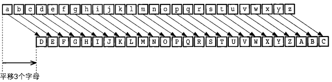 现在我们将字母表平移3个字母,于是,明文中的a在加密后就变成了与其相隔3个字母的D,以此类推。b变成E,c变成F,d变成G…v变成Y,w变成Z,而x则会回到字母表的开头而变成A,相应地,y变成B,z变成C。通过下图我们可以很容易地理解“平移"的具体工作方式。比如英文