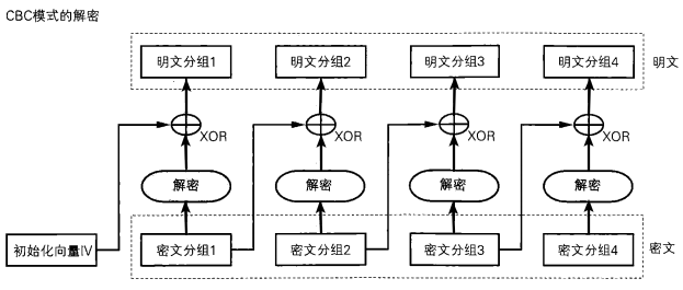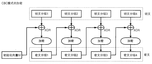 XOR异或操作,然后再进行加密。而第一个数据块需要用初始化向量IV进行异或操作后再进行加密。初始化向量:当加密第一个明文分组时,由于不存在前一个密文分组,因此需要事先准备一个长度为一个分组的比特序列来代替前一个密文分组,这个比特序列称为初始化向量(initialization vector),通常缩写为 IV。一般来说,每次加密时都会随机产生一个不同的比特序列来作为初始化向量。