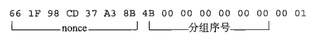 计数器生成方法:每次加密时都会生成一个随机数(nonce)作为计数器的初始值。当分组长度为128比特(16字节)时,计数器的初始值的格式为:其中,前面8个字节为nonce,每次加密都会生成一个新的none值。后面8位位分组序号,这部分会逐次累加。