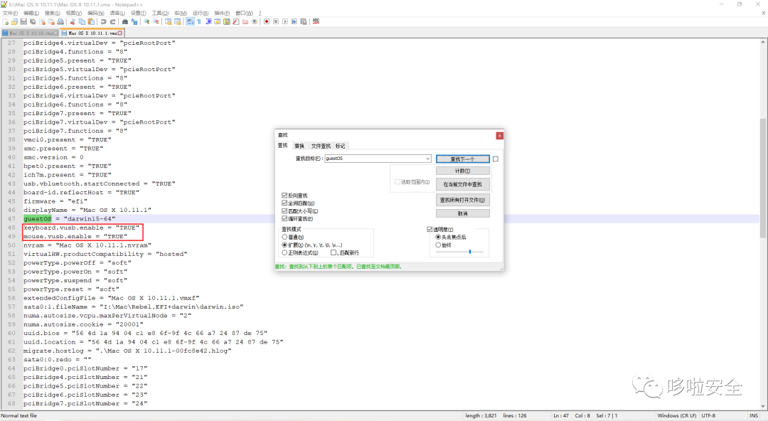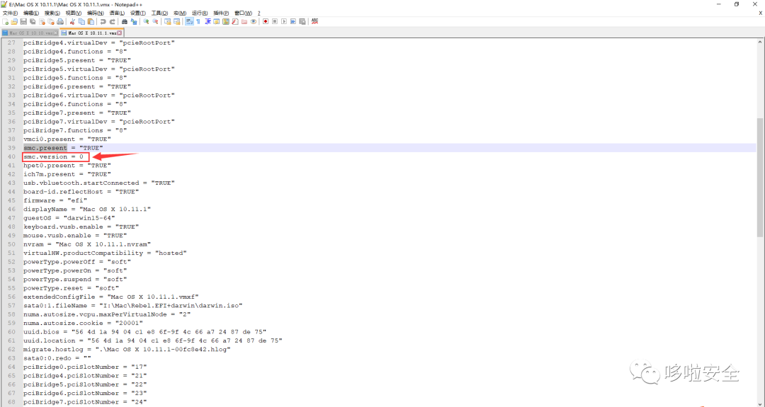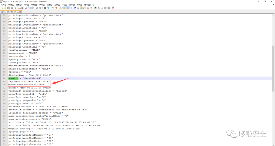 (1).修改Mac OS X 10.10.vmx或Mac OS X 10.11.1.vmx的配置,找到guestOS的配置在下面添加如下配置