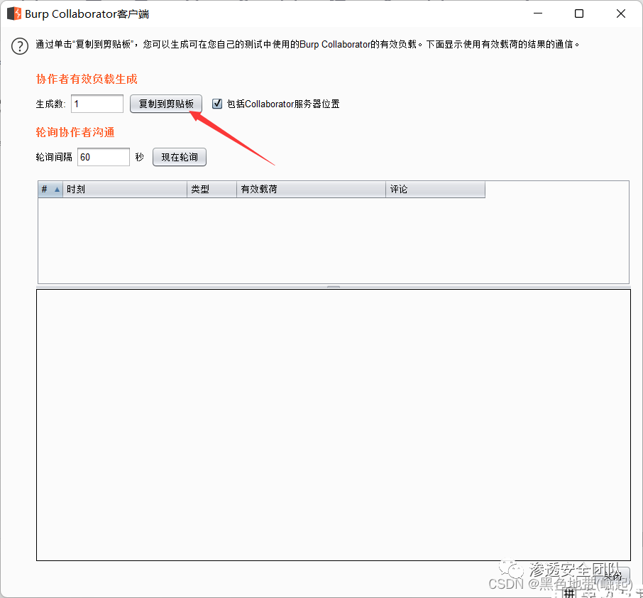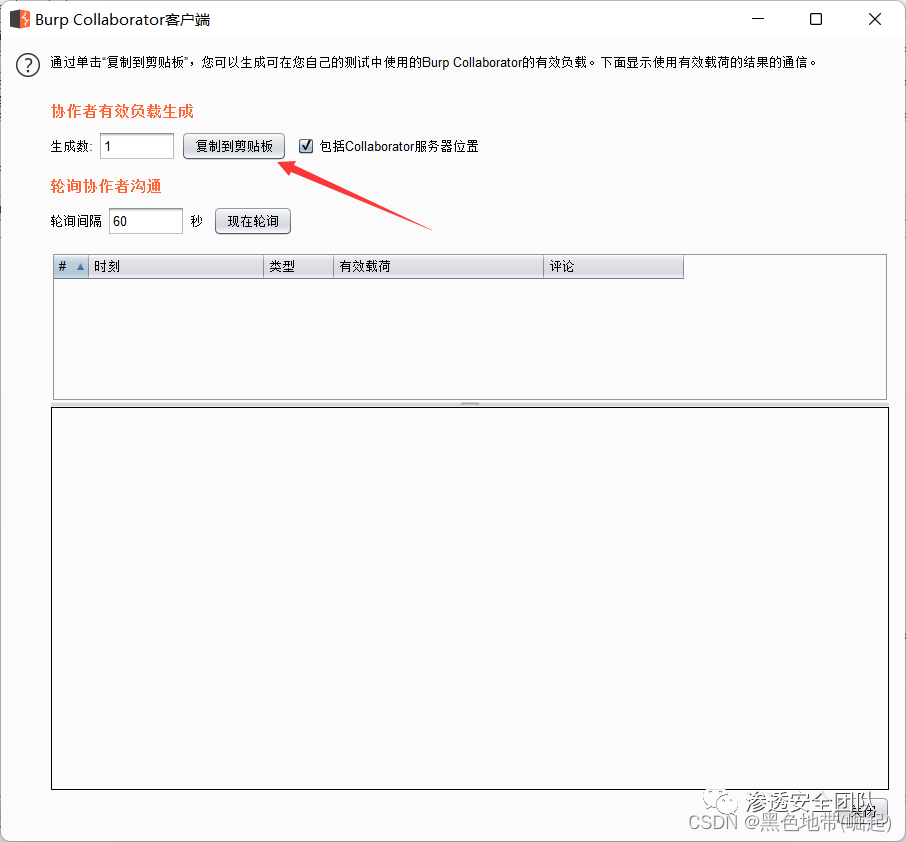 BP选项卡---BC客户端---复制服务器URLhttps://xqrbsy7k0bvri28avnpps3ddb4hu5j.burpcollaborator.net