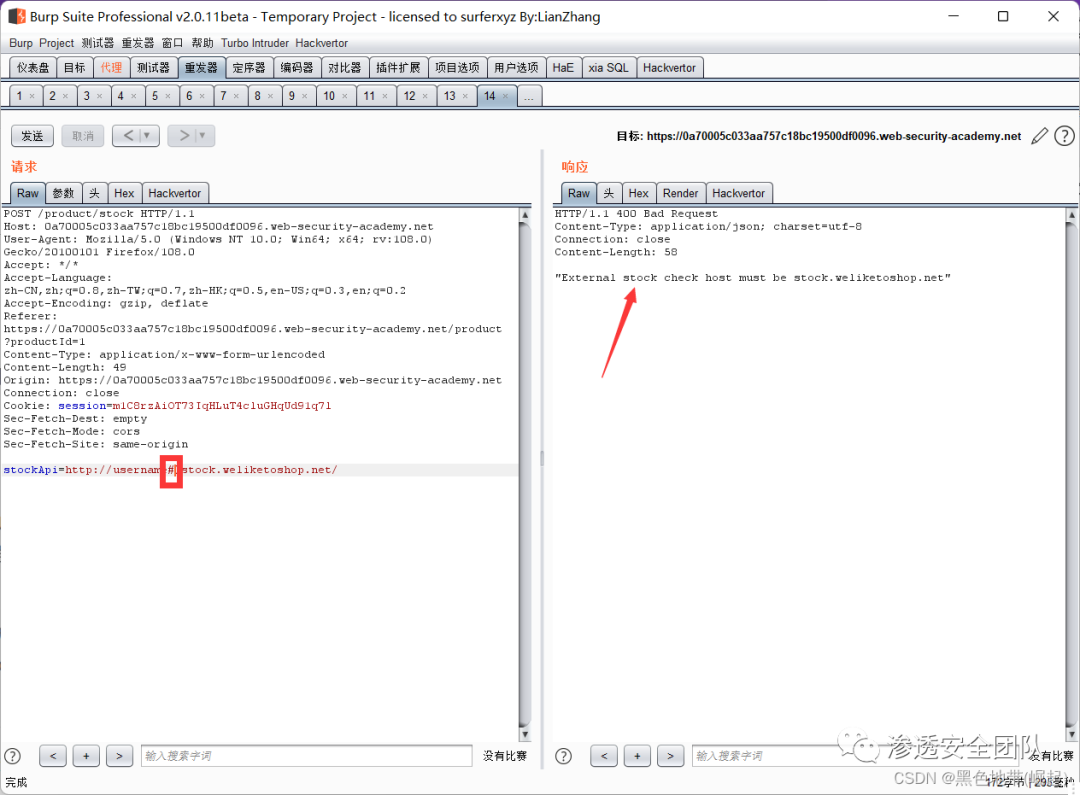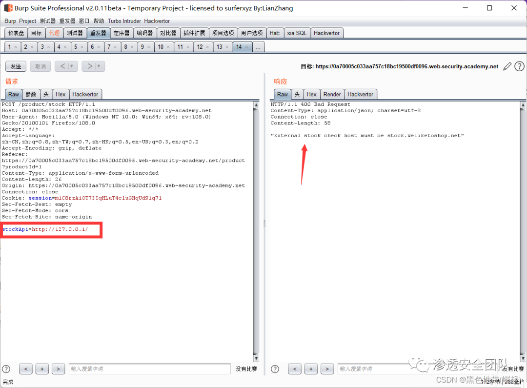 访问一个产品,点击"检查库存",使用BP拦截请求,并将其发送到repeater