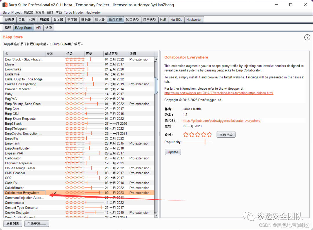 在Burp Suite Professional中,从BApp Store安装"Collaborator Everywhere"扩展