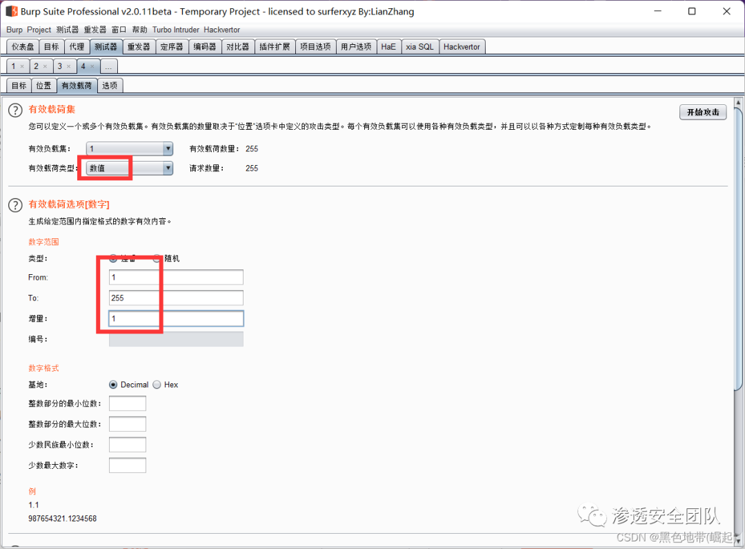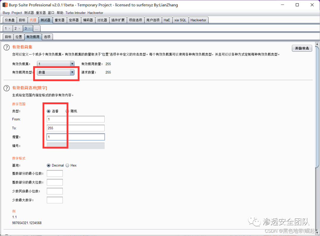 Payloads设置,将有效负载类型更改为Numbers,并在"From"、"To"和"Step"框中分别输入1、255和1