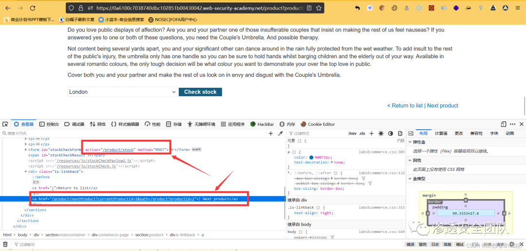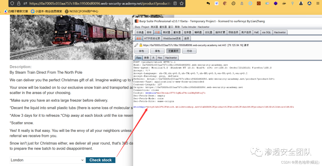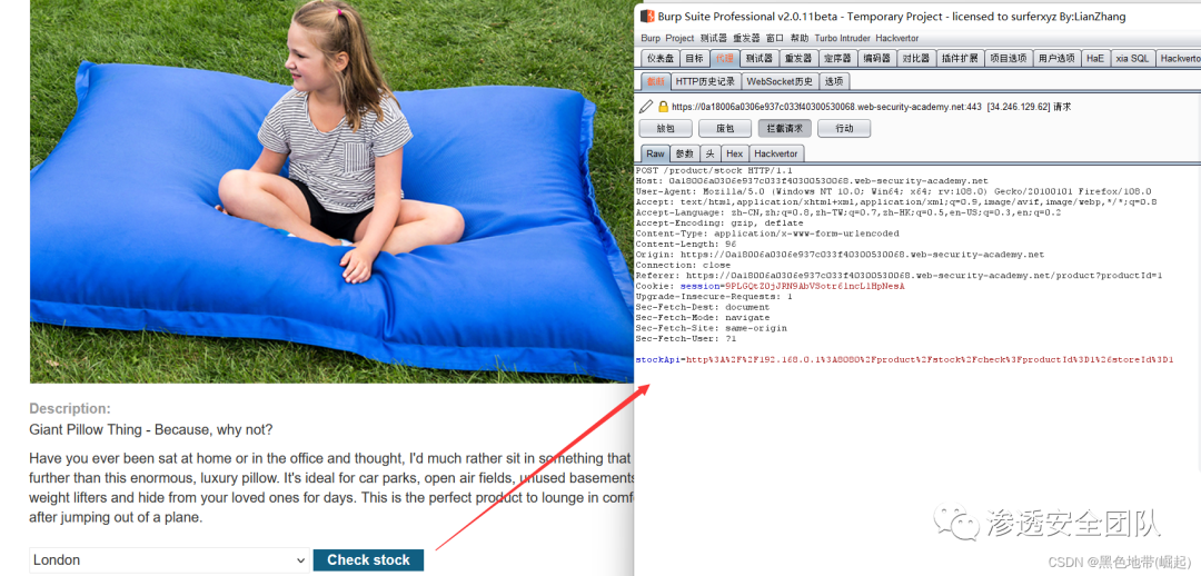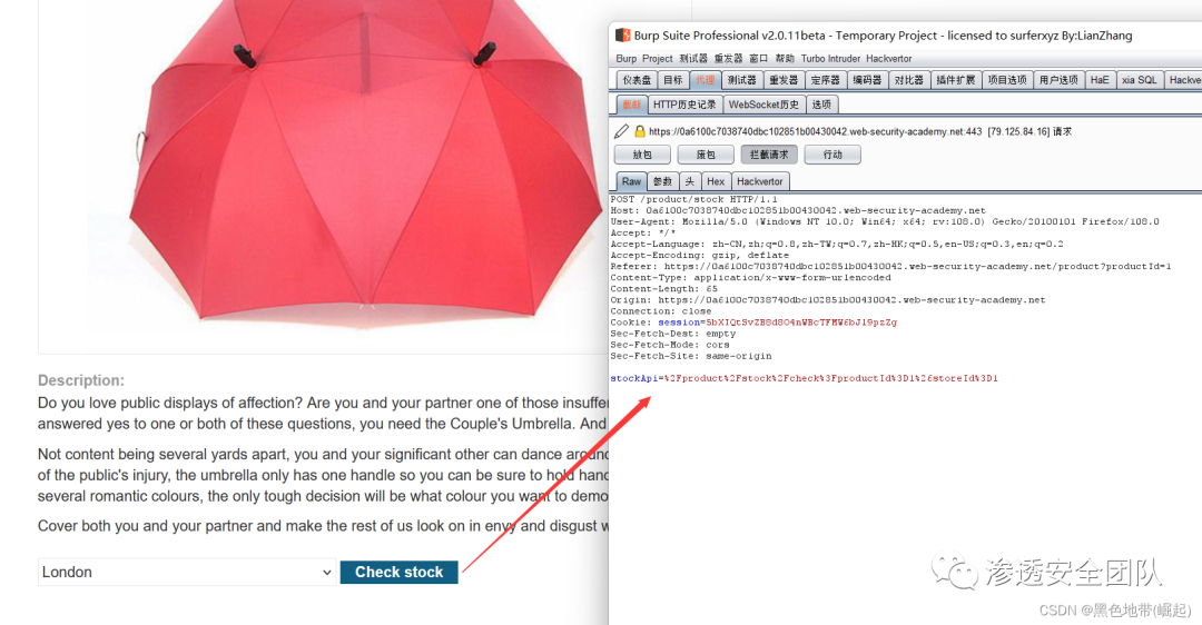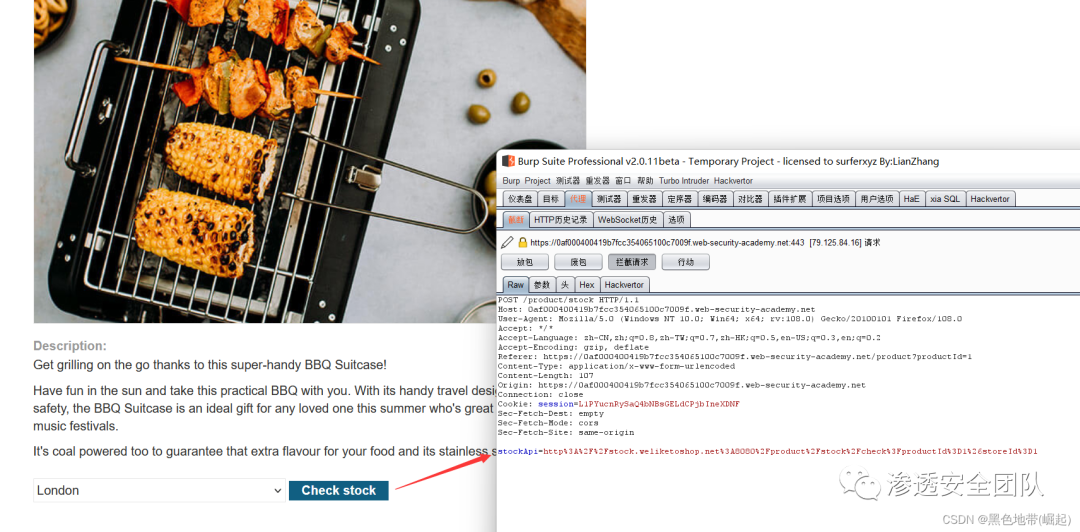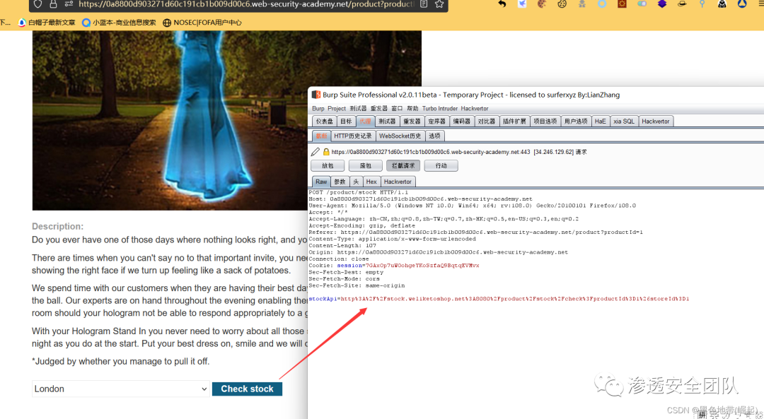 访问一个产品,点击"检查库存",在Burp Suite中拦截请求