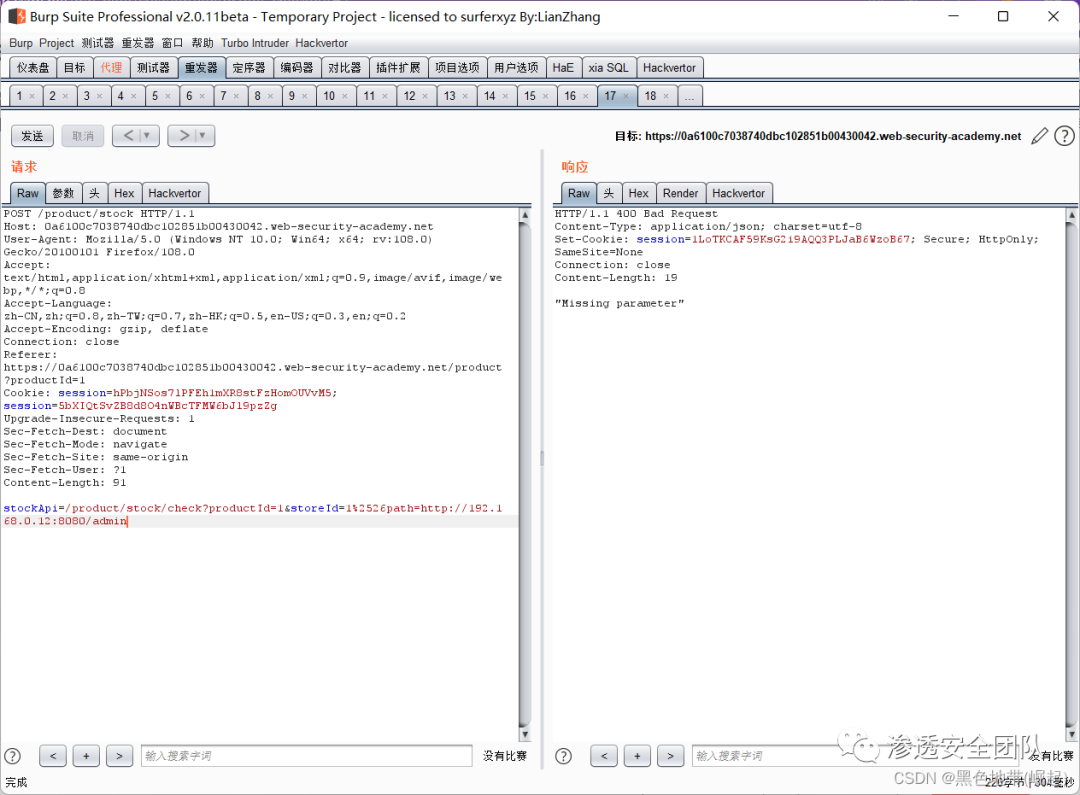 访问一个产品,点击"检查库存",BP拦截请求,并将其发送到repeater