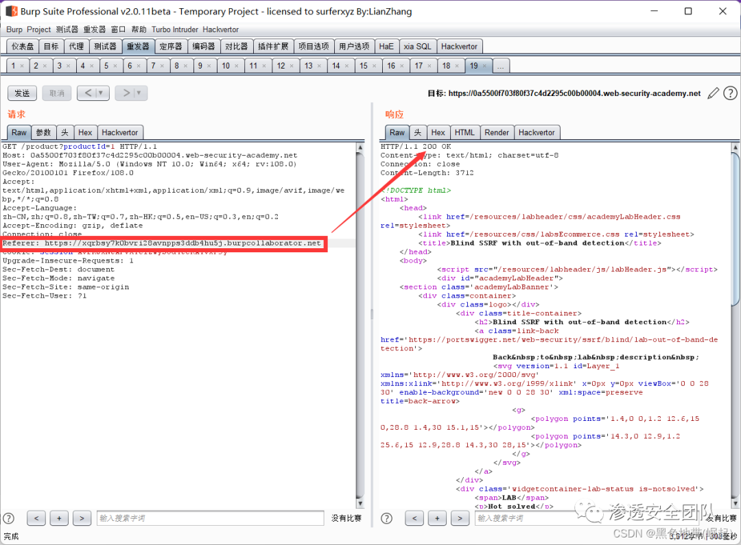 以使用Burp Collaborator生成的域替换原始域(Referer),发送请求
