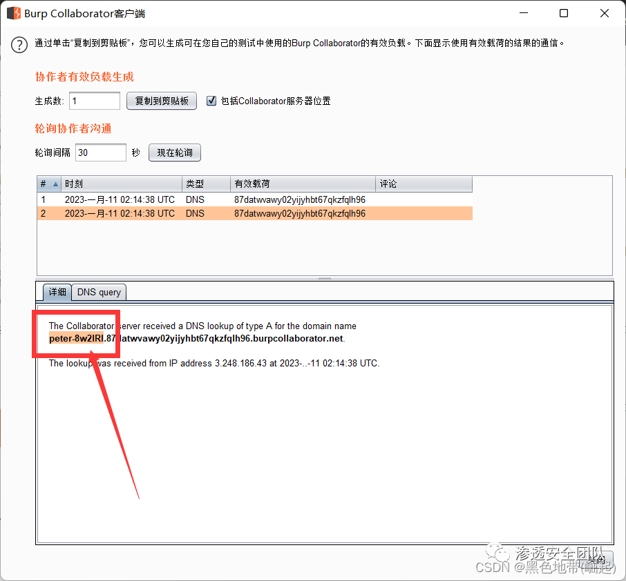 攻击完成后,返回Collaborator选项卡,然后单击"立即轮询"。应该看到一个DNS交互,它是由被成功的盲SSRF攻击击中的后端系统发起的。操作系统用户的名称应显示在DNS子域中。