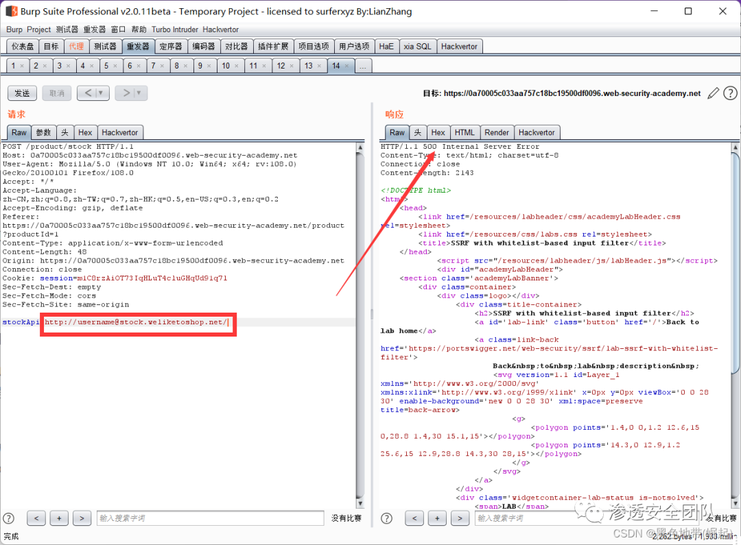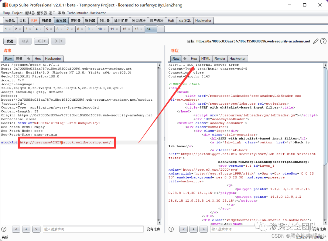 双URL将#编码为%2523,并观察非常可疑的“Internal Server Error”响应,该响应指示服务器可能已尝试连接到“username”