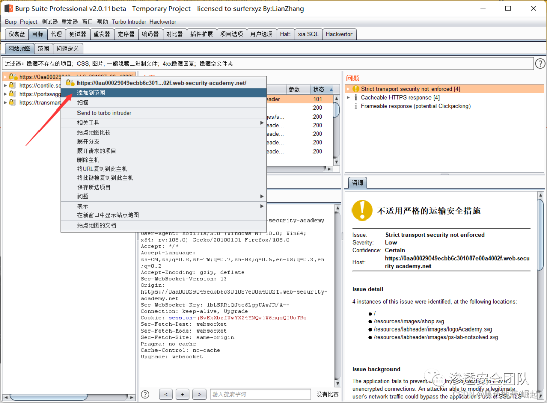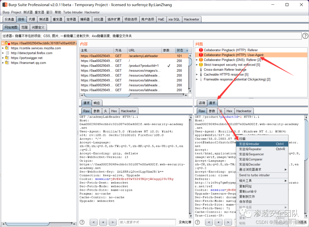 将实验室域添加到Burp Suite的目标范围,以便Collaborator Everywhere将其作为目标。