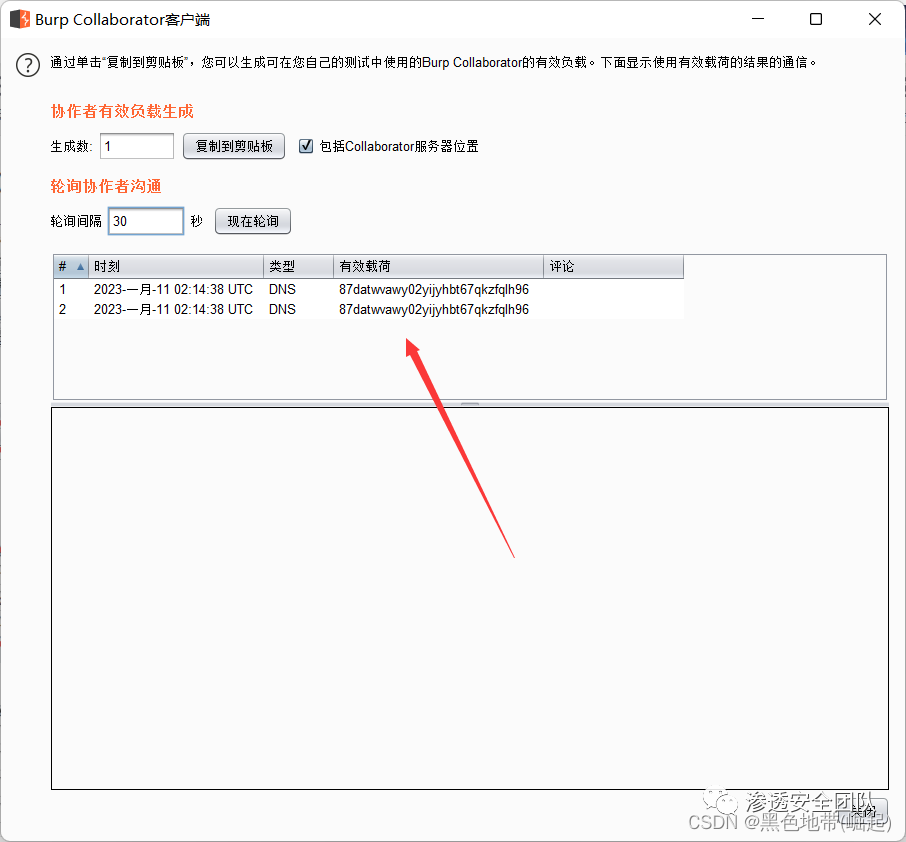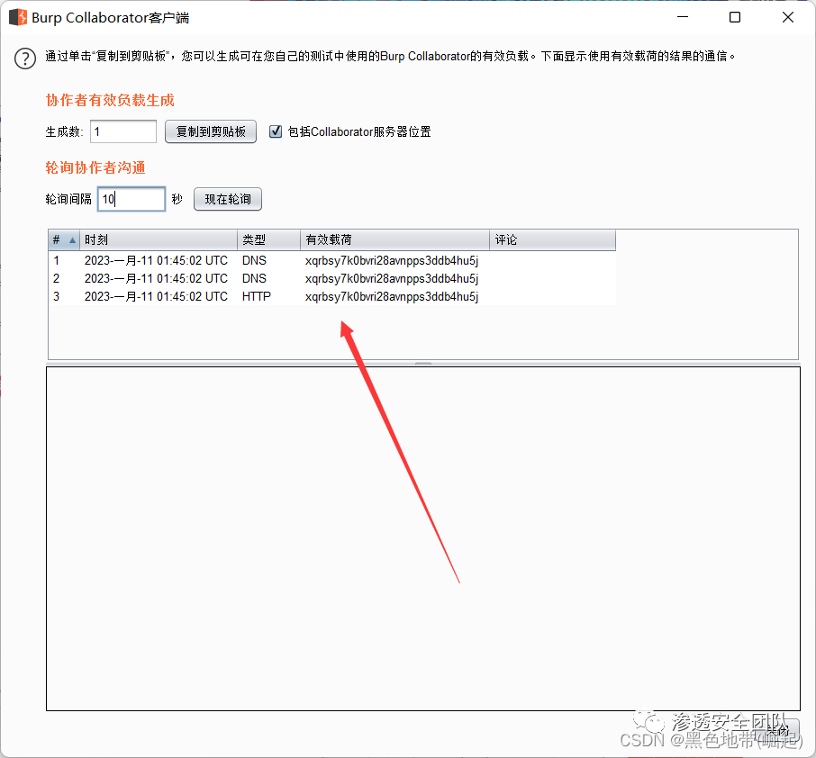 转到Collaborator选项卡,再刷新,查看交互信息(看到一些DNS和HTTP交互,这些交互是应用程序由于负载而启动的)
