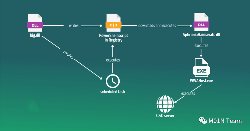 执行解码后的powershell脚本实现下载又一段payload,并调用regsvr32.exe执行,同时创建任务计划作持久化:间隔执行该powershell脚本;