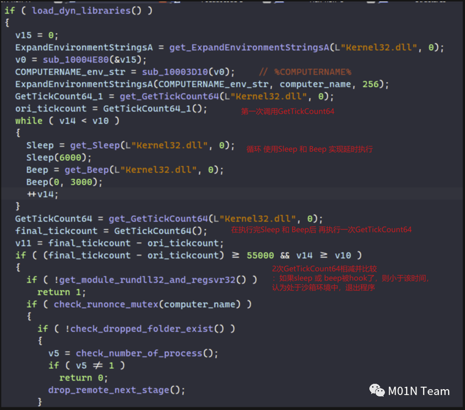 再一次调用GetTickCount64记录时间戳,并比较。如果 GetTickCount64[2] - GetTickCount64[1] 的时间少于sleep与beep延时调用的时间,说明程序的sleep 或者 beep的API被hook,判定程序处于沙箱环境中,则退出程序;