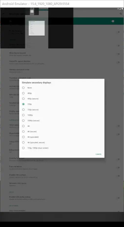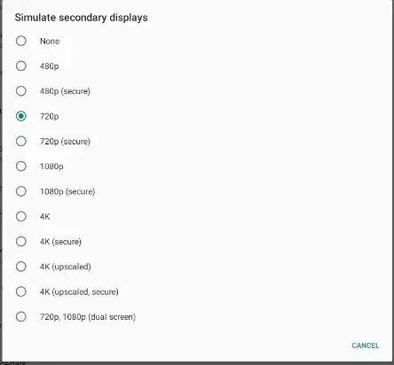 模拟器中打开"设置-开发者选项"界面,在列表中找到"Simulate secondary displays"条目。