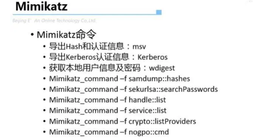 Mimikatz是一款开源凭据转储应用程序,能够提取帐户的用户名和密码信息(通常是采用哈希或明文密码的形式)。用户可以读取和存储身份验证信息,比如Kerberos票据,然后可以使用这些信息执行横向移动和访问受限制的数据。