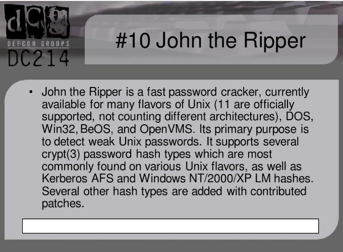通过使用蛮力技术,John the Ripper可以破译密码和诸多算法,比如DES、MD5、Blowfish、Kerberos AFS和Hash LM等。