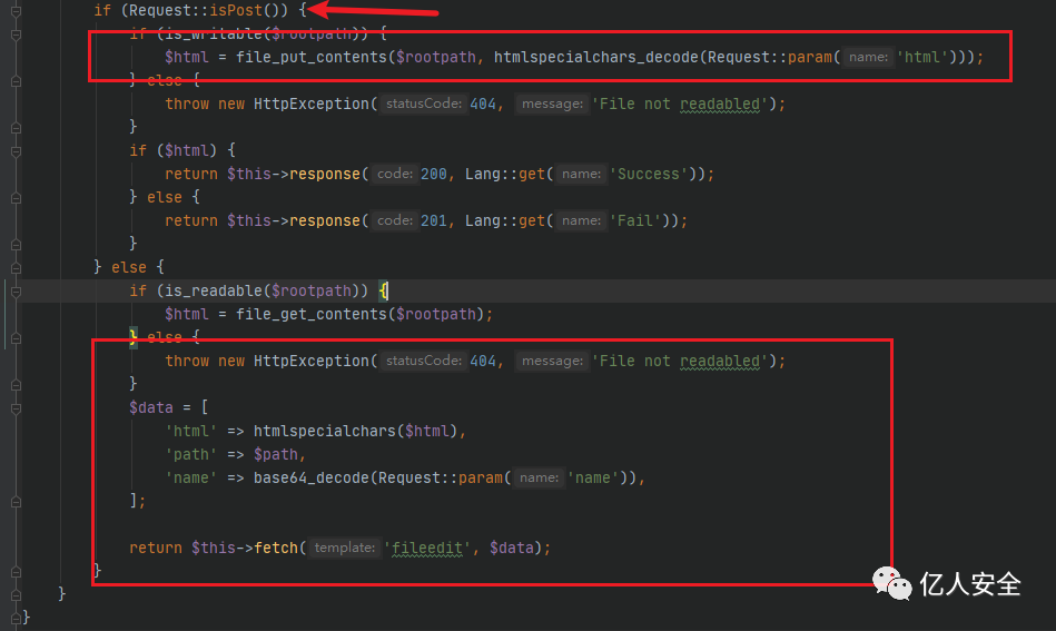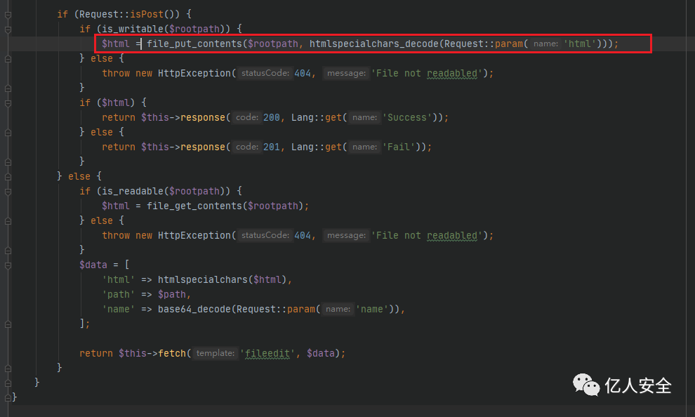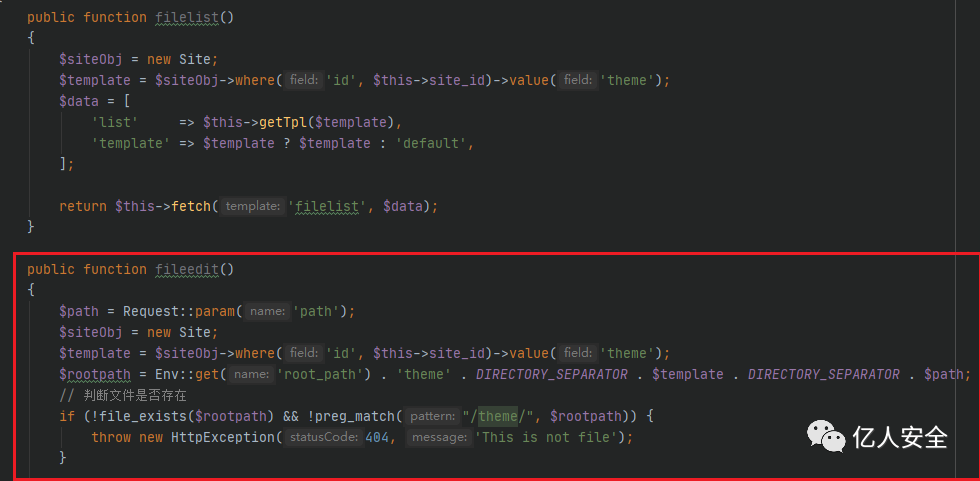 的,前面的htmlspecialchars_decode()是将实体编码后的特殊字符还原,然后在继续看$rootpath参数,向上回溯该参数,在这里最后拼接 $path 参数是通过 param() 传过来的,所以这里 $path 可控。