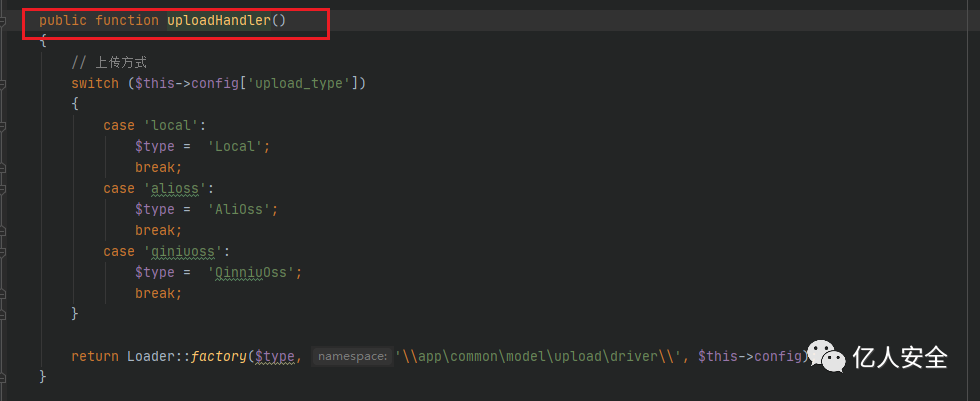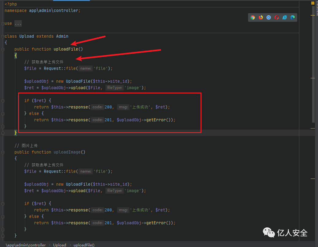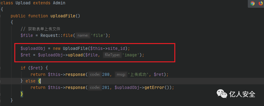 进入application/admin/controller/Upload.php,发现uploadFile方法。