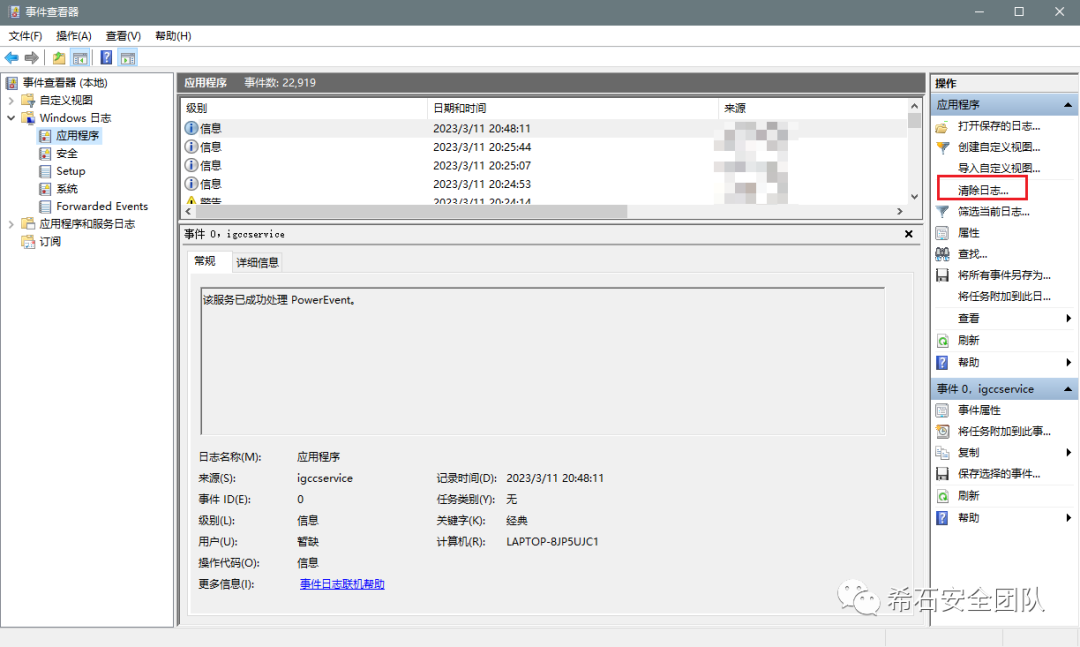 应用程序日志(Application Log):应用程序日志记录了与应用程序相关的事件,例如应用程序崩溃、错误等等。攻击者可能需要清除应用程序日志,以掩盖他们的入侵活动。应用程序日志文件存储在 %SystemRoot%\System32\winevt\Logs\Application.evtx 中。