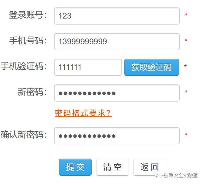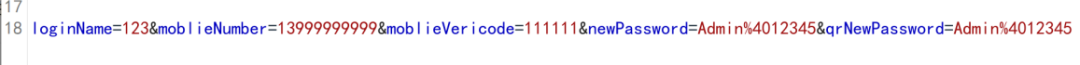 输入我们已知账号,然后再输入一个任意手机号,任意验证码以及符号要求的密码,点击提交抓包。