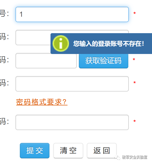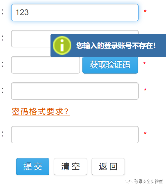 不仅需要账号,还需要手机号,我们输入任意账号,返回账号不存在。
