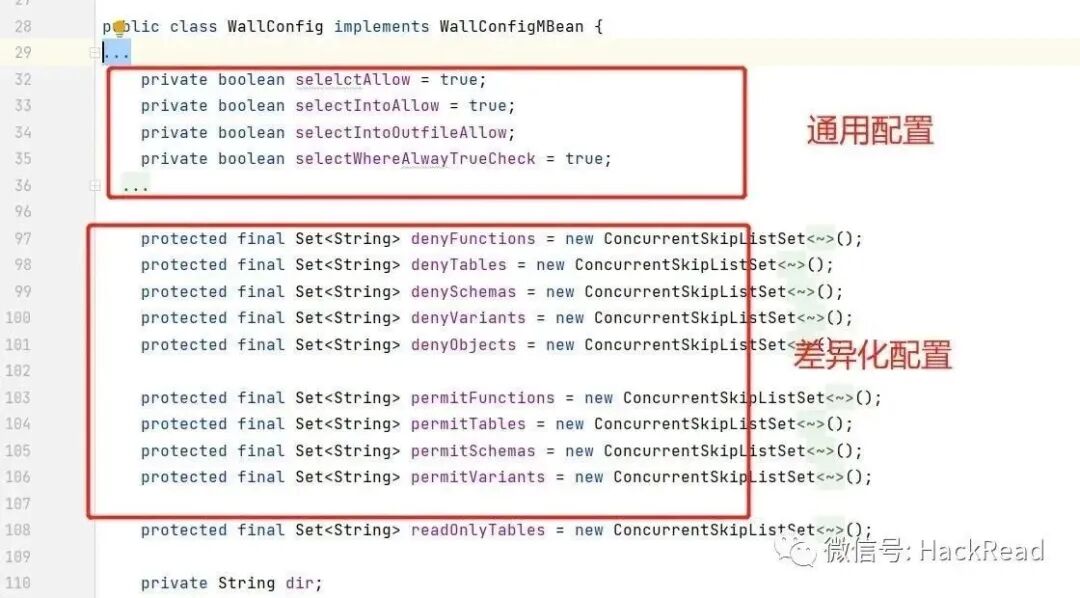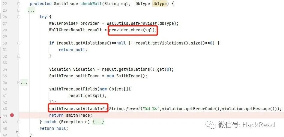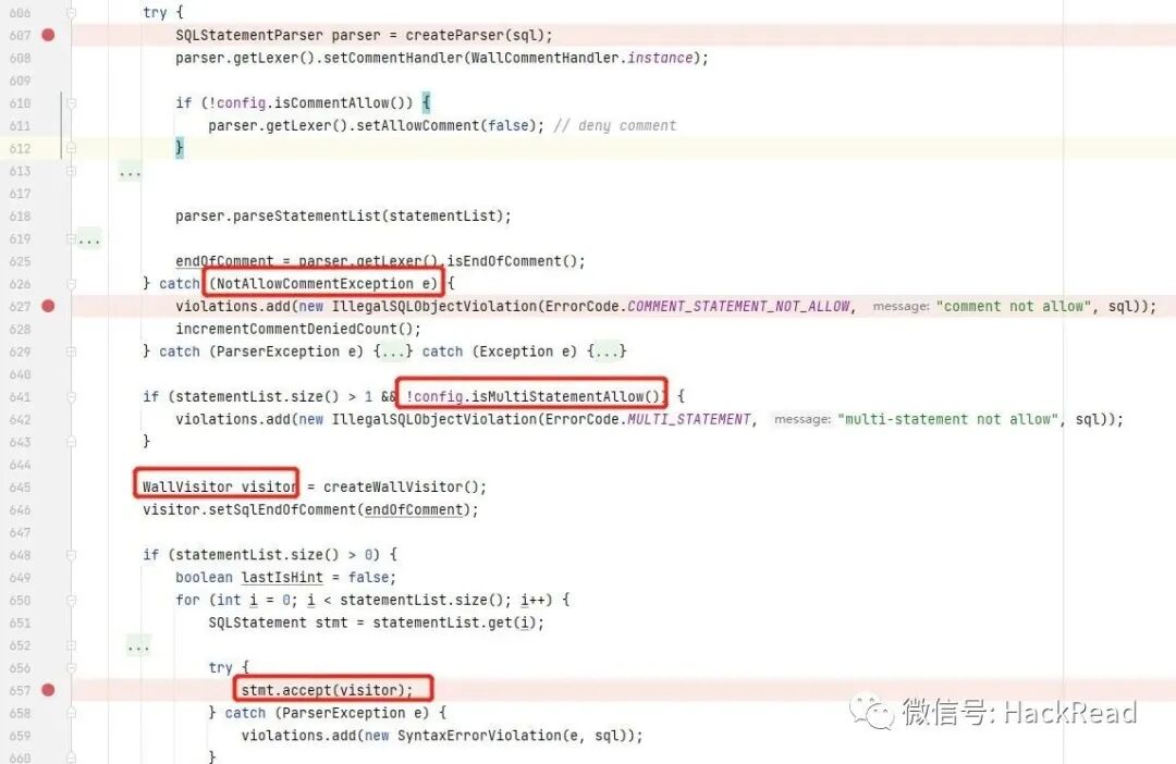 com.alibaba.druid.wall.WallProvider#checkInternal :该方法下的这段代码就是 WallFilter 的核心功能,先根据配置情况拦截 带有注释的SQL语句、堆叠查询的SQL语句,随后创建 WallVisitor,而 WallVisitor 拥有多种检查项,包括禁止变量访问或是变量黑名单、禁止永真语句、禁止黑名单函数、禁止访问黑名单表(数据库系统表)等,其中一些复杂的情况则被设置成配置选项,如禁止写文件。检测不通过则SQL语句会被加入黑名单,检测通过则SQL语句与参数化后的SQL语句都会被加入黑名单。
