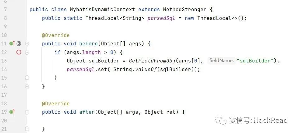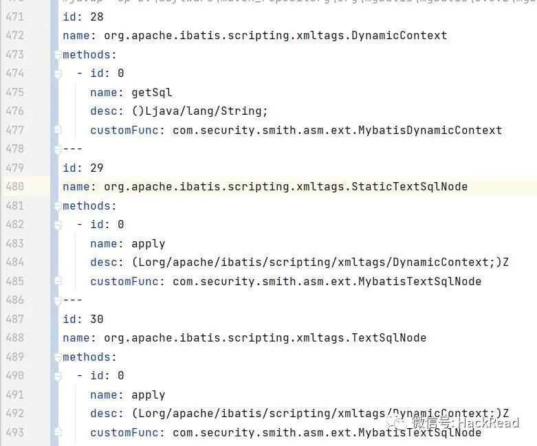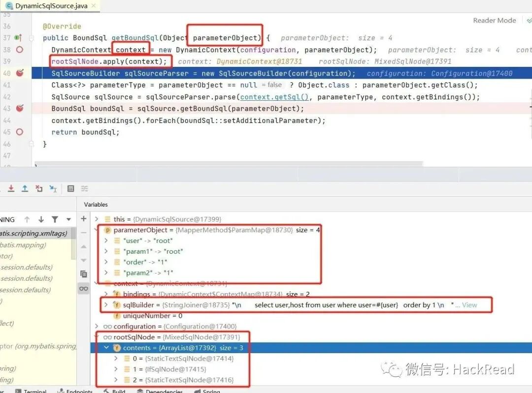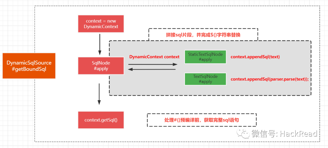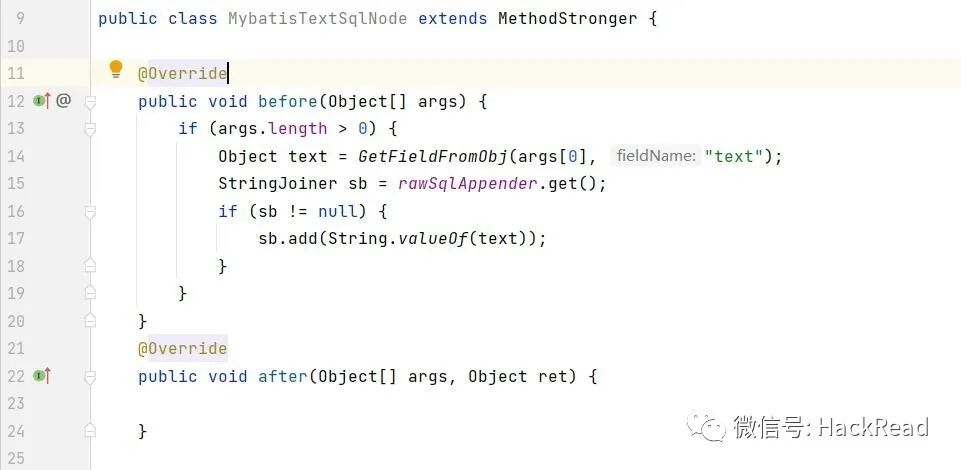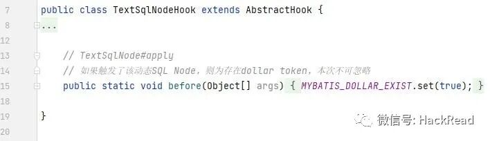 含有 ${..} 的SQL片段只会保存在TextSqlNode中, 我们继续hook TextSqlNode,如果触发了该hook点,则认为本次sql不可忽略